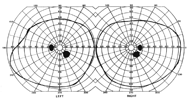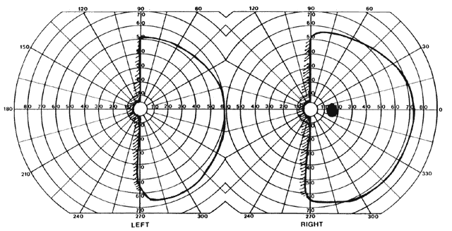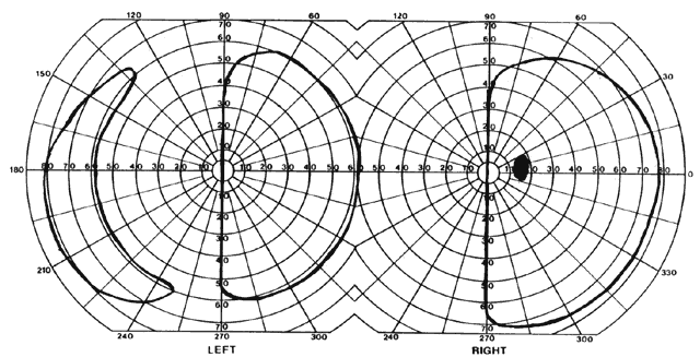 Inouye17 and Holmes and Lister18 found that in area 17 the foveal representation of the retina is located near the occipital pole, and the peripheral visual field is represented anteriorly. These insights came from studying the pattern of visual field defects in soldiers with penetrating wounds of the occiput. Further study has revealed a well-defined and orderly retinotopic arrangement of the visual field in area V1.19 The superior bank of the calcarine fissure contains cortex corresponding to the superior retina (inferior visual field), while the inferior bank contains the representation of the superior visual field. Most anterior is the representation of the monocular temporal crescent, the region of temporal field in the contralateral eye that lies beyond the limits of the nasal field (60°) of the ipsilateral eye. As is true of most of the visual system, the peripheral field is less represented than central vision. In V1, more than one half of cortex is devoted to the central 10° of vision (“cortical magnification”). Occipital cortex contains a mixture of monocular and binocular cells arranged in ocular dominance columns; however, there is no gross separation of ocular inputs. VISUAL FIELD DEFECTS FROM STRIATE LESIONS Focal destruction of the visual cortex produces a scotoma, defined as a region of the visual field within which the patient cannot reliably report the presence of targets of specific size and luminance, tested with either kinetic targets (e.g., Goldmann perimetry20) or static targets (e.g., threshold automated perimetry [Allergan, 1987]). These defects are located in the visual field contralateral to an area V1 lesion and are homonymous, being present in similar regions of the visual fields of both eyes. Their homonymous nature reflects the decussation of the nasal retinal fibers at the optic chiasm. As opposed to visual defects caused by lesions of the optic radiations and especially by lesions of the optic tracts, the hemianopic defects from V1 lesions are highly congruent, meaning that the scotoma or defect in one eye is virtually identical to that in the other eye (Figs. 3 to 7). This reflects the anatomic convergence of the inputs of one eye with that of the other in area V1.