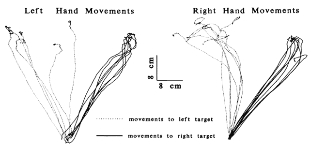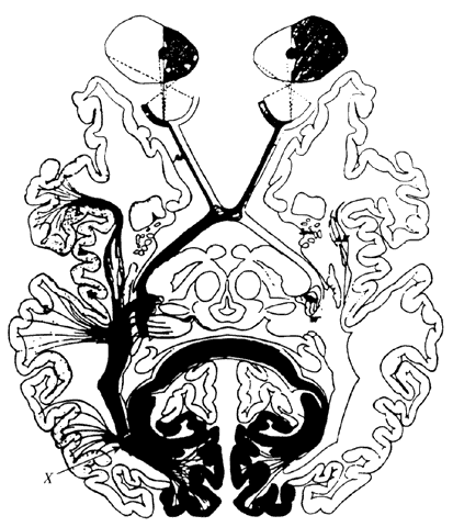 The visual fields in Balint's patient were reportedly normal for white objects and colors, and visual acuity was 20/40 or better; however, the man's attention appeared to quickly wane, producing a “concentric constriction” of the useful field of view. Balint believed his subject could see only one object at a time, no matter what its size. He reported that the man's focal point of attention was displaced 35° to 40° into the right hemifield and that he would read the letters only at the right ends of lines of text, a finding compatible with a left hemineglect syndrome (see Fig. 12). Defective reaching was worse with the right hand, and Balint believed both hands should have been affected equally if the problem was just visual. Also, when Balint positioned the left hand, the man could imitate the same position with his right hand, showing that position sense was normal. The patient died of cerebrovascular complications, and an autopsy was performed (Fig. 13). Balint emphasized that the subject had bilateral lesions of the angular gyri and that the calcarine cortex was preserved; however, there was also extensive damage to other visual areas and connections, including damage to the posterior corpus callosum and white matter bilaterally as well as the pulvinar of the thalamus. Holmes's 1918 report210 on disturbances of visual orientation is often compared with Balint's. Holmes studied six soldiers with missile wounds of the occiput causing “an affection of the power of localizing the position in space and the distance of objects by sight alone.” The men had “moderately good” visual acuity and stereoacuity, and Holmes doubted that their various visual field defects (including homonymous hemianopia, quadrantanopia, paracentral scotomata, and extensive loss of peripheral vision) could account for their visual disorientation (i.e., errors in judging the relative location and distance of objects). The soldiers failed to detect objects presented in their “normal” visual fields if they were otherwise occupied, but Holmes distinguished this from “the unilateral ‘disturbance of visual attention;” that occurs “as a result of parietal and lateral occipital lesions.” He believed that his subjects' difficulty counting coins and navigating were due to multiple defects, including the spatial localization defect, failure to attend to objects in the periphery, and defective fixation and search. Altogether, their abilities “contrasted unfavorably with a blind man.” Two soldiers (cases 2 and 5) died, and autopsies were performed. The soldier in case 2 had an entry wound in the lateral surface of the right occipital lobe, with exit in the area of the left angular gyrus affecting the “dorsal portions of the sagittal bundles” in both hemispheres, “posterior to the splenium and dorsal to the calcarine fissures,” in the region of the parieto-occipital sulci. In case 5, the soldier had an entry wound in the left hemisphere destroying the supramarginal gyrus, with softening toward the central fissure. The missile tract lay above the splenium, and the exit wound affected the right angular gyrus. Craniometric assessments of the entry and exit wounds in the skulls of the survivors also suggested similar bilateral dorsolateral lesions. Hécaen and Ajuriaguerra210a are credited with coining the term Balint's syndrome. They reported on four patients with “minor forms of Balint's syndrome” who showed sluggish exploration of the visual environment, which they attributed to “sticky fixation,” or restriction of fixation to a single point. They also recognized a “motor component” of their patients' defects, relating it to possible damage in posterior parietal and occipital association cortices concerned with ocular pursuit. Precise anatomic localization was not possible, as in most cases that antedate the era of modern neuroimaging procedures. Luria211 reported on “disorders of simultaneous perception” in a Polish officer, shot in the head in the waning days of World War II. The brain damage resulted in “vestibular giddiness,” “fits,” and severe constriction of the visual fields on a perimetric examination. The patient could perceive objects “in an essentially normal manner,” but “moved his eyes from one object to another in a confused and inadequate manner” leading to “failure to fixate one or more of the objects present.” The patient tended to neglect objects on the left, as did the patients of Balint, Holmes, and Hécaen and Ajuriaguerra. Luria's212 subject also showed defective hand movements under visual guidance, and “his gaze manifest the same helplessness as his arm.” He believed that his patient had “limitation of visual attention,” “incapacity to combine details into a coherent whole,” and “piecemeal perception” due to a “weakness in cortical tonus” within the visual cortex causing each “focus of excitation” within that area to “inhibit the remainder of the visual cortex by negative induction.” There have been several objections to the need for the designation “Balint's syndrome.213” The full syndrome is generally associated with a wide variety of behavioral disturbances, which raises questions as to the existence of a specific underlying mechanism. These disturbances include cortical blindness, Anton's syndrome (denial of cortical blindness), bilateral visual field defects including central or paracentral scotomata, bilateral upper quadrantanopia, metamorphopsia, palinopsia, monocular polyopia, poor visual acuity, cerebral akinetopsia, and dementia (Table 7).213 Many aspects of the disorder are indistinguishable from the hemineglect (right parietal lobe) syndrome, violating the principle of autonomy for a syndrome.