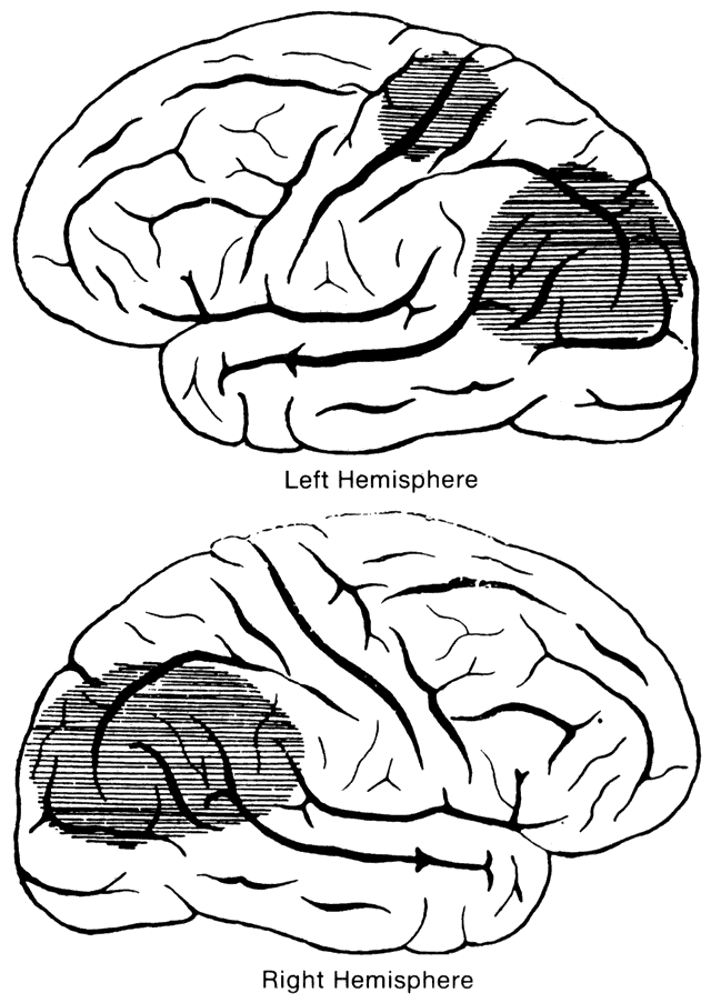 ANATOMY AND PATHOLOGY. The typical lesion in prosopagnosic cases lies in the inferior occipitotemporal cortex, in the fusiform and lingual gyri (Fig. 8).100,111,112 Opinion has varied as to whether prosopagnosia requires bilateral lesions. The early cases of Wilbrand (1892) and Heidenhain (1927) had bilateral damage.89 Reviews by Meadows112 and Damasio and colleagues100 stressed that all autopsies of prosopagnosic patients revealed bilateral lesions of the inferior occipitotemporal cortex; in some cases, the left-sided lesion was not suspected before the patient died.98,113 Other evidence for the requirement of bilateral lesions include studies of split-brain subjects showing mechanisms for facial recognition in both hemispheres and the lack of prosopagnosia in patients with right hemispherectomy89 (see Sergent and Villemure95 for an exception). Modern neuroimaging has also confirmed bilateral lesions in many cases with computerized tomography (CT),93,96,104,106,107 MRI,89,106 and positron-emission tomography (PET).114
