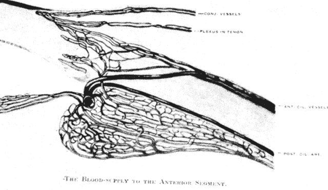 VASCULATURE The lacrimal artery, the superior and inferior medial palpebral arteries, and the branches of the ophthalmic artery that supply the extraocular muscles and ciliary body form the rich blood supply of the conjunctiva, eyelids, and lacrimal gland (Fig. 1).1 This blood supply can be thought of as a natural immunologic defense. When the eyes are inflamed, the blood vessels dilate, fluid leaks into the extravascular spaces, and leukocytes migrate into these spaces from the bloodstream. More specifically, macrophages, polymorphonuclear leukocytes, lymphocytes, C-reactive protein, immunoglobulins, and so forth are the elements of the defense system that are brought to these ocular tissues during inflammation.2