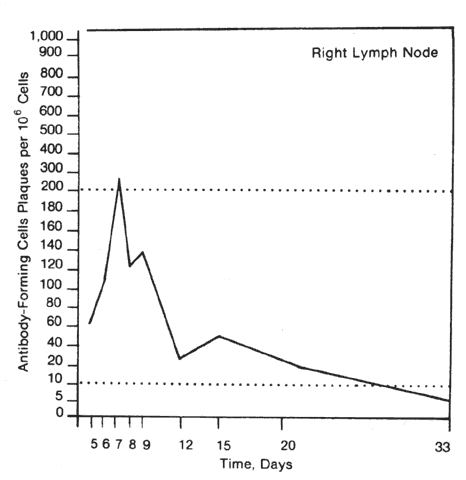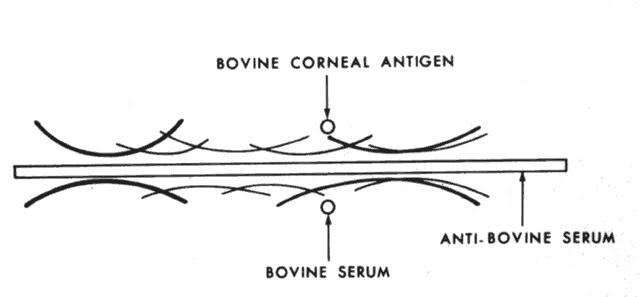Since many blood vessels are grossly visible in such tissues as the conjunctiva, immunologic inflammatory disease, which produces only subtle changes in buried organs such as the kidney, may cause conjunctival inflammation that is readily apparent early in its course. There are neurogenic and nonneurogenic causes of vasomotor activity. The capillaries, precapillaries, and small arterioles are activated by chemical materials; the large vessels near the terminal arterioles are activated by the nervous system. The nonneurogenic causes are complicated but are basically (1) the vasoactive amines, including histamine and 5-hydroxytryptamine, (2) the serum proteases and polypeptides known as kinins, and (3) the prostaglandins. Most inflammatory reactions, in which the vessels dilate and their permeability increases, are biphasic: there is an immediate response (medicated by histamine-like substances) that reaches its maximum 8 to 10 minutes after application of the noxious stimulus, and there is a late response (mediated by kinins and prostaglandins) that occurs after an intervening normal period. Since the normal cornea is devoid of blood vessels, the immunologic mechanisms are less effective and the tissue does not respond readily to antigenic insults (i.e., microorganisms, corneal grafts, and so forth). Necrosis and the subsequent accumulation of polymorphonuclear leukocytes vascularize the cornea and alter its privileged immune status.3 The behavior of corneal allografts is illustrative. When the results of one series were averaged, hosts with avascular corneal beds had rejected 3.5% of the grafts in 10 months, hosts with mildly vascularized corneal beds had rejected 13.3% in 4 months, and hosts with moderately vascularized corneal beds had rejected 65% in 2 months.4 It has also been shown that in experimental animals, 95% of lamellar corneal grafts and 75% of penetrating grafts placed in avascular beds survived for long periods of time. This was true even in animals sensitized by permitting them to reject large skin grafts from the same donors that provided the corneal buttons. These amply sensitized animals could not convey the sensitized lymphocytes to their avascular corneas.5 It is also significant that the graft rejection line usually starts at the site of maximum vascularization (Fig. 2). Trauma and non-graft-related inflammation (both of which dilate the vessels) and interrupted sutures left in place too long (causing neovascularization) can increase graft rejection by affecting the vasculature. LYMPHATIC VESSELS AND REGIONAL LYMPH NODES The lymphatics are arranged in pretarsal and posttarsal plexuses and are connected by cross channels. The posttarsal channels drain the conjunctiva and tarsal glands, and the pretarsal channels drain the skin and skin structures. Both groups drain from the lateral side into the preauricular and parotid lymph nodes, and from the medial side into the submandibular lymph nodes. Although cell-lined lymphatic vessels do not occur in nonvascularized corneas, their presence in vascularized corneas seems to have been well established by the experimental work of Collin, Busacca, Mann, Aoki, and Smolin and their colleagues.6–10 Lymphatics and regional lymph nodes play a significant role in immunologic reactions (e.g., in transplantation). Certain tissues, such as hamster cheek-pouch, testes, brain, anterior chamber, lens, and avascular cornea, are devoid of conventional lymphatic drainage. Privileged in this respect, they support the continued growth of grafted tissue.11,12 In the conjunctiva and vascularized cornea, however, the lymphatics increase the host's ability to recognize nonself corneal antigen. Langerhans' cells, which are more abundant peripherally in the cornea than centrally, may process the antigen, thus enhancing immune responsiveness. Depletion of these cells may prolong nonrecognition and graft survival. After the unilateral intracorneal injection of rabbit eyes with bovine gamma globulin, many antibody-forming cells are found in the homolateral draining lymph nodes, corneal limbus, and uveal tract. The first sites at which these antibody-forming cells can be detected are the draining nodes (Fig. 3).13