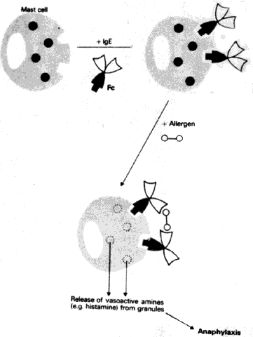 ANAPHYLACTIC HYPERSENSITIVITY REACTIONS Antigen reacts with the Fab fragment of a specific class of antibody (IgE or reaginic antibody) that is bound to the subepithelial mast cells through a specialized region of the Fc fragment. This leads to degranulation of the mast cells and the release of vasoactive amines (histamine, heparin, platelet activating factor, leukotrienes, kinins, and prostaglandins34 in the tissue (Fig. 5). This, in turn, causes dilatation of the small venules and increased permeability of the capillaries. The result is edema and hyperemia such as is seen in hay fever conjunctivitis, a condition that does not last long and can be treated successfully with vasoconstrictors, cyclic adenosine monophosphate enhancers, or by antihistamines, which compete for histamine (H) receptor sites.35 H1 and H2 receptor sites are probably present in the external ocular tissue.