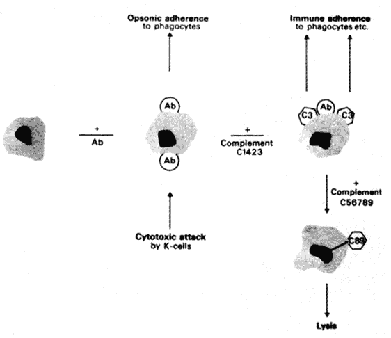 Vernal keratoconjunctivitis and atopic keratoconjunctivitis differ from hay fever conjunctivitis by virtue of their heavy round-cell infiltration. Although the reason for the accumulation of this cell type is unclear, it may be due to the participation of a cell-mediated immune response (cutaneous basophilic hypersensitivity reaction) in these conditions. Bee stings of the cornea or adnexal tissue result in rapid edema and hyperemia of the affected tissue.36 In some cases the bee sting may be more complicated than a simple histamine reaction, probably because of its toxic components or the activation of complement and the attraction of leukocytes to the site. CYTOTOXIC REACTIONS The binding of antibodies to an antigen on the cell surfaces causes a phagocytosis of the cell by (1) opsonic or immune (C3b) adherence, (2) cytotoxicity by killer cells, or (3) lysis through the operation of complement (Fig. 6).