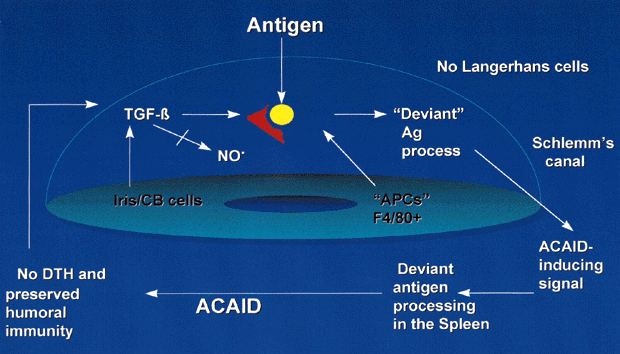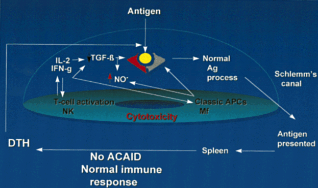 APCs, antigen-producing cells; ACAID, anterior chamber-associated immune deviation; CMI, cell-mediated immunity; ICAM, intracellular adhesion molecule; IFN, interferon; IL, interleukin; MHC, major histocompatibility complex; NK, natural killer; TGF, transforming growth factor; TNF, tumor necrosis factor; Th, helper T.