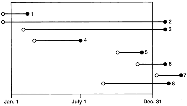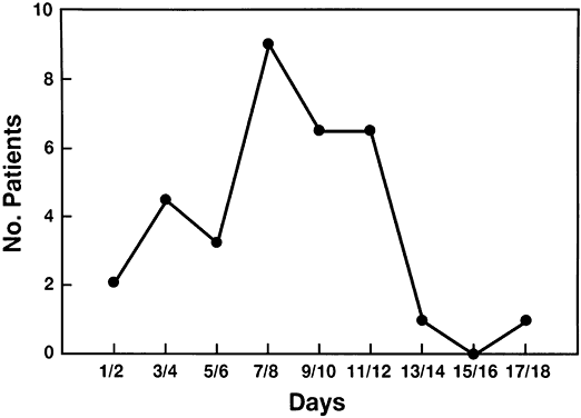 The epidemiologic features of a group of patients with a given ocular infection may identify a source that would aid in developing preventive strategies. For example, identifying the features of postoperative infections by an infection control office can help ensure that devices used for ophthalmic surgery meet adequate sterility requirements. In the outpatient clinic, ongoing surveillance can lead to the rapid recognition of office outbreaks, although community-acquired cases continue to occur (Fig. 13). Some less common infectious eye diseases are caused by parasites with complex cycles; recognizing the role of an intermediate host is needed to describe the epidemiology of onchocerciasis, cysticercosis, and other conditions. Fatal infections transmitted by ocular contact include the acquired immunodeficiency syndrome (from contaminated blood), rabies (from corneal transplantation), and herpes B infection (from infected monkey). Zoonoses affecting the eye include cat-scratch diseases, toxoplasmosis, histoplasmosis, and psittacosis. Transmission of an infection can be expressed mathematically as R = B × C × D, where R = basic reproductive rate of an infection, B = average probability that an infected individual will infect a susceptible contact, C = average number of new contacts per unit time, and D = average duration of infectiousness.37 The number of new infections produced by an infected individual is thus determined by the transmissibility of the infective agent, the rate of contact, and the duration of infectivity. Infection control aims to reduce the rate of infection and to bring the reproductive rate below 1.0 by altering one or more these variables. Incidence can be used to measure infectivity. For example, one epidemiologic study reported that Candida parapsilosis endophthalmitis developed in 1.8% of patients exposed to a particular balanced salt solution during cataract surgery.38 The attack rate is the number of new cases of a disease occurring within the infection's incubation period divided by the number of people exposed to the index case. Table 9 shows the secondary attack rates in two day care centers and the tertiary attack rates among the children's families and within the community during an epidemic of adenovirus keratoconjunctivitis.39 In this example, differing secondary attack rates in two day care centers may reflect different susceptibilities between the two groups or the efficacy in the second center of a preventive strategy, such as handwashing or segregation of infected cases. Other epidemiologic studies have found adenovirus conjunctivitis in approximately 25% to 35% of close contacts. For comparison, household attack rates for other common viral diseases are 76% for measles, 61% for varicella, and 31% for mumps.40