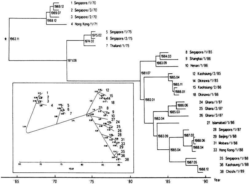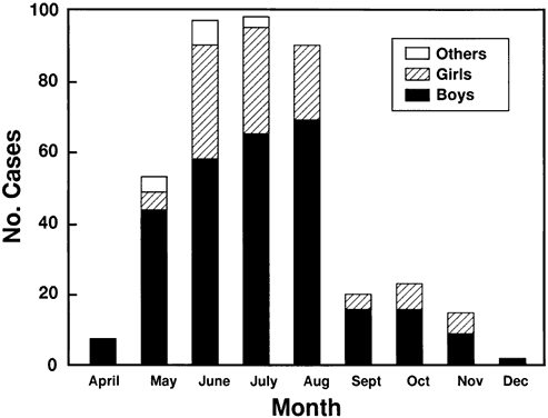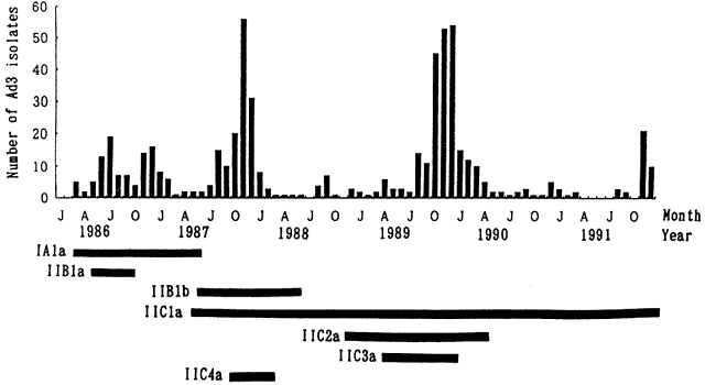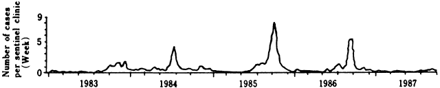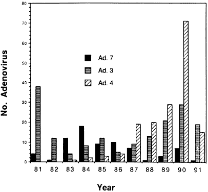 Changes in disease frequency occur for many contagious diseases that have ocular manifestations. Many childhood viral infections are characterized by an incidence rate that increases with increased exposure. The incidence then gradually declines among older age groups because the number of susceptible people decreases. Herd immunity of a population may also partially explain the emergence of one viral strain as another wanes (Fig. 9), although route of transmission and mobility of individuals probably play major roles. Knowing the endemic disease frequency and the distribution of a condition is often a prerequisite for recognizing an emerging problem. |