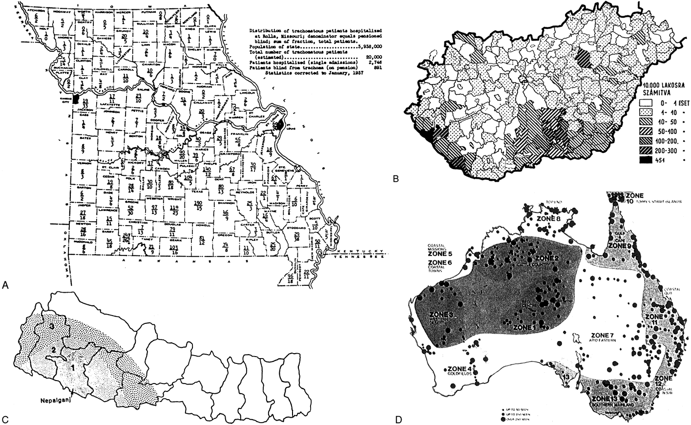 Passive surveillance relies on the recognition and reporting by practicing ophthalmologists.60 Sources of information on disease frequency can be sought from governmental statistics and surveillance programs, national and international disease registries, private health agencies, and professional organizations.61 A provisional registry can be established when a common-source outbreak of ocular infections occurs or when the emergence of a new infectious disease is suspected (Fig. 15). Goals of a registry are to identify at-risk patients, to detect cases, and to disseminate information. Surveillance data help determine secular trends, seasonal variations, and other clustering in time or place that can flag the emergence of an epidemic. For example, spatial and temporal clustering of cases of postsurgical endophthalmitis or infected scleral buckles is a tip-off to the hospital infection control office that a contaminated source in the operating suite should be sought.62 Changes in medical and ophthalmologic practices can also be monitored by surveillance systems, such as the Professional Services Review Organization, the Commission of Professional and Hospital Activities, and the Health Care Financing Association. Surveys A population survey assesses the prevalence of a disease or exposure. For example, comparing the number of patients treated for contact lens-related ulcerative keratitis to the total number of contact lens wearers yielded one of the first estimates of the proportion of microbial keratitis among people who used soft contact lenses.63 Surveys are also used to monitor the prevalence of trachoma in endemic parts of the world (Fig. 16). A geographic information system can map potential risk factors with disease occurrence. Procedures have been developed for population-based sampling surveys.64 National (see http://www.lib.umich.edu/hw/public.health/health.stats. html) and other cross-sectional statistics broadly suggest the importance of infectious diseases (Table 19). Economic development lowers the impact of infection to less than 1% of blindness. However, ocular infectious and inflammatory diseases still account for 5% of visual disability in some developed countries65 and from 10% to 50% in several developing nations.66–68 At the end of the 20th century, infections accounted for 26 million blind people and 42 million individuals with seriously impaired sight.