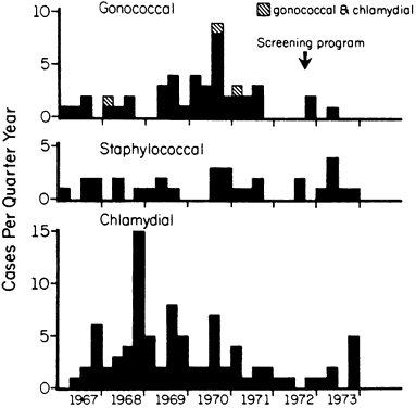 Gonococcal conjunctivitis develops in from 30% to 42% of newborns who are exposed to N. gonorrhoeae during delivery. Between 25% and 50% of neonates exposed to C. trachomatis during delivery acquire chlamydial conjunctivitis. The attack rate during a common-source outbreak in a newborn unit can exceed 10%. Seasonal variations in neonatal conjunctivitis correspond to fluctuations in maternal gonorrhea and chlamydiosis. Because the rate of adult gonorrhea peaks during late summer and fall in the United States, so does gonococcal neonatal conjunctivitis (Fig. 28). VARICELLA ZOSTER VIRUS DERMATOBLEPHARITIS Varicella zoster virus (VZV) outbreaks are common in closed communities such as schools, camps, and hospitals, where many nonimmunized children are exposed to an infected individual. VZV does not occur in an epidemic pattern, although a rising incidence is following the AIDS epidemic. Rare outbreaks of shingles, with an attack rate of 5% to 10%, have followed re-exposure to VZV. For chickenpox, secondary attack rates among susceptible household contacts is 70% to 90%. Chickenpox peaks in winter and early spring in the northern hemisphere; VZV has no seasonal variation. HERPES SIMPLEX VIRUS KERATITIS Outbreaks of primary HSV infection can occur among nonimmune individuals who are intimately exposed to another infected person. Most epidemics have occurred at schools, camps, and hospitals but infrequently involve the eye.140 In an outbreak among wrestlers attending a training camp, 34% were infected and 8% had primary herpetic blepharoconjunctivitis.141 Outbreaks have also occurred among rugby players and other athletes. MICROBIAL KERATITIS When proprietary eyedrops came into widespread use in the mid-20th century, some solutions such as fluorescein became contaminated and led to cases of pseudomonal keratitis.72 In-use contamination still occurs, but common-source outbreaks of keratitis in developed countries are rare. In many parts of the world, however, traditional medications used for treating the eye remain an important cause of corneal ulceration.142 A similar sequence of events occurred with the development of contact lenses. During the early years of production, some soft lenses were apparently contaminated at the manufacturer by P. aeruginosa or filamentous fungi and led to clusters of microbial keratitis when the lenses were fitted. Improper handling by an eye care practitioner is still a potential source for an outbreak of corneal infection.143 The widespread use of contact lenses and the associated increased frequency of microbial keratitis during the 1980s was described as an epidemic144 and led to a change in the spectrum of microorganisms causing corneal infection in developed countries. P. aeruginosa, Acanthamoeba species, and other waterborne organisms that could survive in contact lens fluids emerged as important infections during this time. The public health impact of contact lens-associated microbial keratitis is substantial, resulting in more than a 400% increase in corneal infections in the United States from 1950 to 1990.145 Several case-comparison studies have compared the relative odds of microbial keratitis for different contact lens types and wearing schedules (Fig. 29). Clusters of corneal infection have also occurred in obtunded, hospitalized patients related to tracheal suctioning and a poor blink reflex.114,146 OCULAR LEPROSY The distribution of leprosy is nonhomogeneous even in an endemic locale. Outbreaks of leprosy in families are often linked with the social and cultural context. In a family with an untreated lepromatous individual, skin lesions develop in up to 50% of that person's children, and approximately 5% to 10% of family members acquire leprosy. OCULAR ONCHOCERCIASIS Epidemic spread of onchocerciasis is measured in decades. In equatorial West Africa, a sequence of infection and blindness has led to a repeated pattern of migration of the population. Tribes settle in fertile river valleys and remain until the level of river blindness reaches an unsustainable level. They then abandon their villages and move to the hills, but move back to the rivers after several generations. This cycle may have gone on for centuries.147 Environmental and climatic changes play a role in the spread of onchocerciasis.148 It is possible that onchocerciasis spread to the Americas with the slave trade, appearing in regions where infected Africans were sent and blackfly vectors already existed. TOXOPLASMIC RETINOCHOROIDITIS Outbreaks of acquired toxoplasmosis are uncommon but have been associated with dust mixed with cat excrement, fecally contaminated water, infected meat or milk, and laboratory accidents (Fig. 30). The ophthalmologist may be the first to recognize a common-source epidemic.149 Epizootics have occurred at animal farms, in captive colonies, and in zoos. In a common-source outbreak of acquired toxoplasmosis, 18% to 42% of exposed people seroconvert. The cumulative risk of retinitis among those infected during a common-source outbreak is about 0.5%,149 although in one outbreak, 4% developed ocular toxoplasmosis.150 Pregnant women who acquire toxoplasmosis can transmit the infection to their fetus's retina.151 CYTOMEGALOVIRUS RETINITIS Cytomegalovirus retinitis does not occur in common-source outbreaks. A rising incidence followed the onset of the AIDS epidemic in the early 1980s then peaked at the end of the 20th century. MICROBIAL ENDOPHTHALMITIS Before 1865, endophthalmitis and other üblen Zufällen [unfortunate coincidences] occurred in 500 to 1100 cases per 10,000 cataract operations. The risk of endophthalmitis after cataract surgery fell with the introduction of antisepsis and improved surgical techniques in the late 19th century and has continued to decline before and during the antibiotic era (Fig. 31). The epidemiology of cataracts and cataract surgery has been studied,150 but large, prospective studies are needed. The postoperative rate of endophthalm