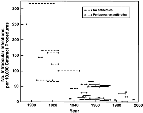 *(From Aaberg TM Jr, Flynn HW Jr, Schiffman J, Newton, J: Nosocomial acute-onset postoperative endophthalmitis survey. Ophthalmology 105:1004, 1998.) †Includes delayed-onset infections.