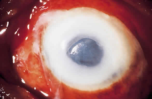 OCULAR INFECTION The two most common modes of nocardial infection are inhalation of organisms with suppurative or cavitary pulmonary infection, often simulating tuberculosis, and contamination of skin wounds with soil, causing a localized mycetoma. Pulmonary or generalized nocardial infections have become increasingly prevalent in immunocompromised patients. Nocardia occasionally may cause infections in other tissue such as brain, kidney, and bone. Keratitis,56–68 conjunctivitis,69 dacryoadenitis,70 uveitis,71 endophthalmitis,72,73 and contaminated scleral buckles have been reported. Nocardia species are a somewhat rare cause of primary conjunctivitis that may be either mucopurulent or granulomatous, sometimes associated with the development of subconjunctival scar tissue and an interstitial or superficial punctate keratitis. Corneal ulceration may occur from the direct extension of conjunctivitis (Fig. 6). Nocardial keratitis usually is preceded by minor trauma. Corneal infection occurs more frequently in young adult males and in rural areas. Such preponderances are likely related to the predisposing roles of minor corneal trauma and soil contact. Nocardial keratitis is characterized by a relatively slow and recalcitrant keratitis. Delay in identification of the causative organism sometimes causes the mistaken topical administration of corticosteroids as adjunctive therapy before a specific diagnosis. The characteristic morphology of nocardial keratitis is its resemblance to filamentous fungal ulcers. Nocardia species should be kept in mind as possible causative organisms in patients who do not respond to antifungal therapy. Minimal involvement of the epithelium with nonspecific punctate epitheliopathy often is encountered. The infiltrate usually is located in the midperiphery of the cornea, adjacent to sites of minor corneal trauma or abrasion, with superficial or midstromal involvement. The typical ulcer has a gray, sloughing base with overhanging necrotic edges (Fig. 7). The stromal involvement tends to be grossly granular or nodular in appearance. A “brush-fire” border of the infiltrates can be observed (Fig. 8). Multiple foci of infection or satellite lesions can sometimes be encountered.
