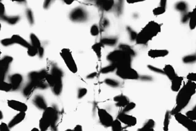 in temperatures up to 50°C. They are commonly isolated on media used for fungal organisms but they are bacteria rather than fungi. They lack a nuclear membrane and have cell walls that contain muramic and diaminopimelic acids but do not contain chitin and glucans. They produce filaments that resemble fungal hyphae but the diameter of these filaments resembles the diameter of bacteria. Their growth is inhibited by antibacterial agents but not by antifungal agents because their cell walls do not contain fungal sterols. Aerobic actinomycetes are ubiquitous in humans, animals, soil, and in compost. Human infections result from inhalation of the bacteria and from traumatic implantation of the organism. Aerobic actinomycetes that are frequently encountered as ocular pathogens in keratitis and endophthalmitis include Nocardia, Mycobacterium, Streptomyces, and Rhodococcus. Other members that are encountered in the clinical microbiology laboratory include Actinomadura, Nocardiopsis, Dermato-philus, and Oerskovia. Aerobic actinomycetes that are capable of growing on Sabouraud dextrose agar incubated at 30 °C include Nocardia, Streptomyces, Rhodococcus, Actinomadura, and Nocardiopsis. Aerobic actinomycetes usually produce an “earthy” or “new mown hay” odor and are identified using colonial morphology and pigmentation; production of a diffusible pigment; morphology on tap water agar; acid fastness; decomposition of casein, tyrosine, and xanthine; urease production; and cell wall analysis. Tap water agar morphology is determined using tap water agar plates (2% granular agar in tap water). The organism is streaked in a straight line on the agar surface, incubated at 30 °C, and examined microscopically for 7 days using a 10X objective. The morphologic characteristics include the presence or absence of aerial and substrate hyphae, presence of typical bacterial coccoid or bacillary forms, and the presence of branched filaments or motile flagellated cells. Antimicrobial susceptibility testing on the aerobic actinomycetes can be accomplished using either a modified Kirby-Bauer disk diffusion technique or an agar dilution system. Antibiotics to be tested include sulfonamides, trimethroprim-sulfamethoxazole, aminoglycosides, second-generation cephalosporins, imipenem, tetracycline, chloramphenicol, vancomycin, and erythromycin. NOCARDIA SPECIES. Growth occurs on Sabourauddextrose agar without antibiotics, Lowenstein-Jensen medium, and Middlebrook 7H11 agar and matures within 7 to 9 days. Colonies on Sabouraud dextrose agar are white to orange, raised, irregular or smooth (Fig. 9). Microscopically on tap water agar are seen thin, delicate, branching, beaded filaments that fragment into bacillary or coccoid forms (Fig. 10). They are gram positive and may be partially acid fast. There are three major pathogens to humans: N. asteroides, N. brasiliensis, and N. otitidiscaviarum.