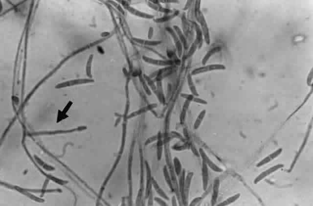 STREPTOMYCES SPECIES. Growth occurs on Sabouraud dextrose agar without antibiotics and matures within 4 to 10 days. Colonies are usually white, but occasionally gray, orange, rose, red, or green. Colonies are folded, hard, leathery, and may develop powdery or chalky appearing aerial hyphae. Filaments may be straight or spiraled and usually produce small rectangular conidia by segmentation (Fig. 11).