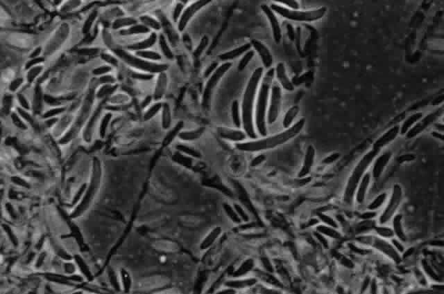 CANDIDA SPECIES. Growth matures within 1 to 3days. Colonies are yeastlike, pasty, smooth, and cream-colored. Certain species of Candida may be inhibited by cycloheximide. They do not produce pigment. Only one species, C. krusei, is capable of producing urease. The genus can be speciated using carbohydrate assimilation testing or carbohydrate fermentation. Candida albicans produces pseudohyphae and large, thick-walled terminal chlamydospores on a Dalmau plate. Species of Candida that have been reported as ocular pathogens include C. albicans, C. tropicalis, C. parapsilosis, C. pseudotropicalis, and C. guilliermondi. CRYPTOCOCCUS SPECIES. Growth matures within 1to 3 days. Colonies are flat or slightly raised, shiny, moist and may be mucoid. The colonies are cream but become tan with age. All species produce urease and are inhibited by cycloheximide. Species of Cryptococcus can be speciated using carbohydrate assimilation testing. None of the species are capable of carbohydrate fermentation. Microscopically visible are blastoconidia of varying size which may have a capsule present and rarely produce pseudohyphae. The primary pathogen for humans is C. neoformans. A perfect state exists for C. neoformans--Filobasidiella neoformans. This organism is a basidiomycetous yeast, is heterophilic (appropriate mating types are necessary), and produces four chains of one-celled basidiospores on a swollen basidium located at the tip of the sporophore. True hyphae are present, which have clamp connections. Because of the requirement for mating pairs, F. neoformans is rarely isolated in the clinical microbiology laboratory. However, on direct examination, one may find the typical hyphae with the clamp connections. RHODOTORULA SPECIES. Growth matures within 1 to 4 days. Colonies are pink, coral, orange, red, or yellow. They are soft, yeastlike, and smooth. The majority of species are inhibited by cycloheximide. All species produce urease. Identification is made using carbohydrate assimilation testing only because they lack the ability to ferment carbohydrates. Microscopically, round or oval blastoconidia are produced. Rare pseudohyphae are produced, but no true hyphae are produced. A small capsule may be present. GEOTRICHUM SPECIES. Geotrichum species areyeast-like organisms. Growth matures within 1 to 4 days. Colonies are white, yeastlike, and moist with a ring of submerged hyphae at the periphery. Growth is better at 25 °C than at 35 °C. They do not produce urease, are inhibited by cycloheximide, and do not ferment carbohydrates. They can be speciated using carbohydrate assimilation testing. Microscopically, no blastoconidia are produced. They produce true hyphae which fragment to form cylindric arthroconidia. The arthroconidia separate at the junction of two septa. TRICHOSPORON SPECIES. Growth matures within 1 to 5 days. Colonies are cream colored, moist, andsoft. With age, the colony becomes yellowish gray, wrinkled, heaped, and more adherent to the agar surface. Members are not inhibited by cycloheximide and do not ferment carbohydrates. Some members produce urease. They can be speciated using carbohydrate assimilation testing. Microscopic findings include true hyphae, pseudohyphae, arthroconidia, and blastoconidia. TORULOPSIS SPECIES. Growth matures within 1 to 3 days. Colonies are small, white to cream in color,smooth, pasty, and yeastlike. Urease is not produced and growth is inhibited by cycloheximide. Species can be speciated based on carbohydrate assimilation and fermentation testing patterns. Microscopically, round to oval blastoconidia are produced. Pseudohyphae and true hyphae are not produced. MALASSEZIA (PITYROSPORUM) SPECIES. Rarely seenin the clinical microbiology laboratory because the majority of species require the presence of lipids in the medium or an olive oil overlay for their growth. Malassezia furfur is the cause of pityriasis versicolor and can be recognized on direct preparations because of its bottlelike shape and the broad isthmus between the mother and daughter cell (Fig. 7).