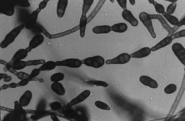 optimum pH of 6. Fungi exist primarily in either a filamentous or yeast form. Dimorphism occurs when certain fungiexist either as a filamentous fungus at 25 °C or as a yeast at 35 °C. Filamentous fungi are characterized by the development of tubular structures termed hyphae which branch and intertwine to form the mycelium. The hyphal walls are parallel because they grow by linear elongation. Hyphae may be either septated or nonseptated. The crosswalls in septated hyphae may be close together or widely spaced depending on the characteristic of the genus. The septations may be either complete or incomplete. An incomplete septum has a central pore which allows the protoplasm to extend from one cell to the next. Certain yeasts are capable of producing pseudohyphae which can be confused with true hyphae. True hyphae can be distinguished from pseudohyphae because true hyphal cell walls are parallel to each other without constrictions of the cell wall at the location of each septum and the septations are straight and easily seen. When fungi are exposed to an unfavorable environment, specialized hyphal structures such as chlamydospores, vesicles, or sclerotia may be produced. Reproduction in fungi occurs either asexually, sexually, or by a combination of both methods. Sexual reproduction involves the union of nuclei or gametes. Asexual reproduction occurs by either fragmentation, fission, budding, or by the formation of spores. In fragmentation, the hyphae break into individual cells called arthrospores. Fission occurs when the yeast cell splits into two daughter cells. Budding is found in the majority of yeasts and occurs when the parent cell produces an outgrowth termed a daughter cell. The daughter cell increases in size and then detaches, forming a second organism. If multiple daughter cells are formed, they may exist in various stages of development. The most common type of asexual reproduction occurs with the formation of spores. These spores are consistent in their size, shape, color, arrangement, and number of cells in each spore; therefore, these characteristics are very important in the identification of the organism. Certain fungi are capable of producing more than one type of spore, for example the macroconidia and microconidia of Fusarium species and the dermatophytes. |