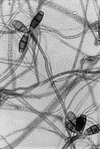 DRESCHLERA SPECIES. Growth matures within 2 to 6 days. Colonies are gray to black. Reverse is dark. Texture is velvety. Microscopically, brown septated hyphae are seen. Conidiophores are septated, brown, and twisted. The conidia are large, multiseptated, and cylindric and are produced in a zigzag fashion. HELMINTHOSPORIUM SPECIES. Growth matureswithin 2 to 6 days. Colonies are dark gray to black. Reverse is black. The texture is cottony to velvety. Microscopic findings include brown septated hyphae. Conidiophores are septated, brown to dark brown, erect, and parallel walled. Conidia are pale to dark brown, obclavate (widest at their base), usually containing more than six cells, and are produced laterally on the conidiophores. ZYGOMYCETES ABSIDIA SPECIES. Growth matures within 1 to 5days. Colonies are white, later becoming gray. Reverse is white. Texture is coarse, woolly, cottony, resembling gray “cotton candy.” Microscopically are seen wide, aseptate, or rarely septated hyphae with rhizoids produced between the sporangiophores (internodal). The sporangiophores are branched and widen just below the sporangia. A septum is present below the sporangium. When the sporangium wall ruptures, the sporangiospores are released, and a short collarette remains on the sporangiophore. The sporangiospores are one celled, ovoid to slightly pear-shaped, smooth and hyaline to light black. MUCOR SPECIES. Growth matures within 1 to 4 days.Colonies are white, later becoming brown to black. Reverse is white. Texture is cottony, resembling “cotton candy.” Microscopic findings include wide aseptate, rarely septate, hyphae without rhizoids or stolons. Sporangiophores are long, often branched with a large spheric sporangium. A collarette may be present after the sporangium ruptures. Sporangiospores are smooth, round, or ellipsoid. RHIZOPUS SPECIES. Growth matures within 1 to 4days. Colonies are white, later becoming gray or yellowish brown. Reverse is white. Texture is woolly, cottony, resembling “cotton candy.” Pathogenic species are capable of growing at 35°C. Microscopic findings include wide aseptate, rarely septate, hyphae with rhizoids produced directly below the sporangiophore. Sporangiophores are long and unbranched with dark globose sporangia. No collarette is present after the sporangium ruptures. Sporangiospores are one celled, ovoid, smooth to roughened and hyaline to brown (Fig. 6).