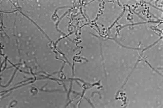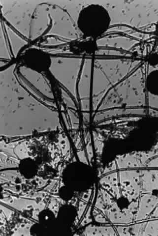 SYNCEPHALASTRUM SPECIES. Growth matures within 1 to 4 days. Colonies are white, later becoming dark gray to black. Reverse is white. Texture is woolly or cottony (“cotton candy”). Microscopically are seen wide aseptate, rarely septated, hyphae. Sporangiophores are short, branched with globose vesicles at their tips. Tubular sporangia containing sporangiospores are attached. Rhizoids may be present. Syncephalastrum species may be confused with Aspergillus species but can be separated based on the tubular sporangia and the absence of phialides. |