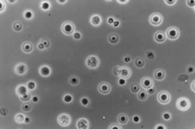 Malassezia pachydermatis can be grown in the laboratory on standard fungal media. Growth matures in 1 to 3 days at 35 °C but is weak or scant when incubated at 25 °C. Growth can be inhibited by cycloheximide. Urease is not produced and carbohydrates are not fermented. Identification is accomplished by carbohydrate assimilation testing. Microscopically, pseudohyphae and true hyphae are absent. One conidium is produced at one end of a vegetative cell. A collarette is produced at the base of the conidium. PROTOTHECA SPECIES. Prototheca species are achlorophyllous algae that can be mistaken for yeast. They are capable of growing on standard fungal media, but they are inhibited by cycloheximide. Growth occurs within 1 to 3 days. Colonies are dull white to cream colored and yeastlike. Urease is not produced and carbohydrates are not fermented. Speciation is accomplished by carbohydrate assimilation testing. Microscopically seen are the presence of sporangia containing sporangiospores (Fig. 8). No pseudohyphae, true hyphae, or blastoconidia are present.