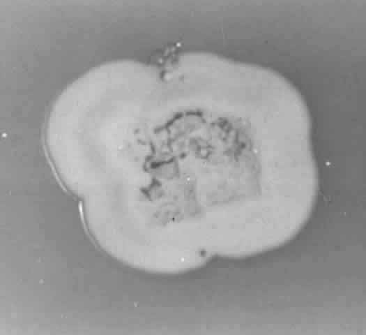 MONILIA SITOPHILA. Growth matures within 2 to 6 days. Colonies are white, then become salmoncolored. Microscopic findings include septated hyphae. Conidiophores produce branching chains of oval conidia, which are produced by continuous budding. Arthrospores are formed when the older hyphae break up. PAECILOMYCES SPECIES. Growth matures within 2 to 6 days. Colonies are white, pink, violet, yellowish brown, or greenish gold. Reverse is white to brown. Colonies spread and have a granular to velvety texture. Microscopic findings include slender delicate hyphae. Conidiophores are septated and have phialides with elongated necks containing long chains of small elliptic or oblong conidia (a penicillus). PENICILLIUM SPECIES. Growth matures within 2 to 6 days. Colonies are white, any shade of green to blue-green, pink, tan, yellow, or orange. Reverse is usually white but may be red or brown due to a diffusible pigment. Colonies are wrinkled with a velvety or granular texture. Microscopic findings include septated hyphae. Conidiophores are either unbranched or branched. The branches are termed metulae and they bear the flask-shaped phialides which contain the unbranched chains of either smooth or rough, round conidia. This entire structure--the metula, phialides and conidia--form the “penicillus.” VERTICILLIUM SPECIES. Growth matures in 2 to 6days. Colonies are first white, then become pinkish brown, red, green, or yellow. Reverse is either white or rust. Colony texture is either powdery or velvety. Microscopic findings include septated hyphae. Conidiophores are erect, simple or branched at several levels, and occur in whorls. Flask-shaped phialides arise from the apex of the branches. Conidia are single celled, oval to cylindrical, and appear singly or in clusters at the ends of the phialides. DEMATIACEOUS FUNGI ALTERNARIA SPECIES. Growth matures within 2 to 6 days. Colonies are gray, grayish white, grayish green, grayish brown, or brown to greenish black with a light gray to white border. The reverse is black. Texture is woolly. Microscopic findings include golden brown to dark brown septated hyphae. Conidiophores are dark brown and septated. Conidia are dark brown, muriform with horizontal and longitudinal septa and are formed in long chains (Fig. 4).