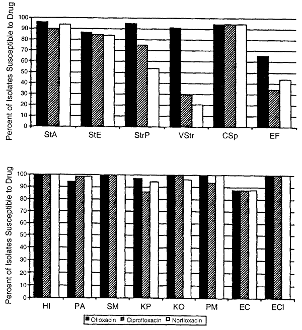 time.47 A similar scenario, from widespread susceptibility to the development of resistance, occurred with ciprofloxacin and other fluoroquinolones. In 1990, quinolones were introduced into ophthalmology and were proposed as an alternative for resistant infections.44 These agents were highly active against a broad array of gram-positive and gram-negative bacteria and were effective against aminoglycoside-resistant strains.48 Within 2 years, however, the first cases of quinolone-resistant bacterial keratitis were reported.49 Fluoroquinolone-resistant ocular infections are now recognized worldwide.50–52 A trend toward progressively higher frequencies of fluoroquinolone resistance has been observed both in gram-positive pathogens (e.g., S. epidermidis endophthalmitis isolates) and gram-negative bacteria (e.g., P. aeruginosa keratitis isolates). Newer fluoroquinolones have improved activity against gram-positive cocci resistant to earlier generation fluoroquinolones, but unfortunately they appear to have no activity against P. aeruginosa resistant to earlier generation quinolones. β-Lactam resistance has also become prevalent among ocular isolates. Longitudinal surveillance data indicate a progressively increasing prevalence of methicillin-resistant S. aureus, penicillin-resistant S. pneumoniae, and β-lactamose producing H. influenzae. Among pneumococci isolated from 1988 to 1995 in Florida,53 14% were resistant to penicillin, with the highest proportion found in intraocular fluid (20%), followed by blepharoconjunctival (15%) and corneal (9%) lesions. In a series from Japan between 1992 and 1995,54 penicillin resistance was found in 15% of pneumococci. A 20-year longitudinal study of penicillin-resistant S. pneumoniae demonstrated the emergent nature of bacterial resistance in Texas55; only 2% of pneumococci recovered between 1976 through 1991 were penicillin-resistant in contrast to 20% obtained between 1992 and 1995 (Fig. 1). A consortium of 12 laboratories in the United States, Canada, Mexico, and Argentina provided an overview of antibiotic susceptibility among ocular infections.56 Using both disk-diffusion and broth-dilution methods to assess the in vitro antibiotic sensitivity of 1,291 bacterial strains isolated from primarily the conjunctiva (42%) and cornea (24%), eight antibiotics were tested. The smallest number of isolates were found to be resistant to ofloxacin and the largest number to erythromycin (Fig. 2). Comparisons of fluoroquinolone sensitivity for the most common gram-positive and gram-negative organisms recovered revealed a similar profile for ofloxacin, ciprofloxacin, and norfloxacin, although several (e.g., S. pneumoniae, E. faecalis, and viridans-group streptococci) were less resistant to ofloxacin (Fig. 3). Interstrain differences in sensitivity between ofloxacin and gentamicin were similar to the pattern found for the fluoroquinolones (Fig. 4). The selection of antimicrobial therapy for ocular infections must account for the presence of resistant strains.57 Among vitreous isolates, over half of enterococci are resistant to gentamicin or cefazolin, and up to a third or more of staphylococci are methicillin-resistant, leading to the recommendation for use as part of the empiric vancomycin treatment of postoperative endophthalmitis.58 The absence of vancomycin resistance in a multicenter study of endophthalmitis therapy59 is noteworthy, but surveillance data from systemic infections indicating increasing vancomycin resistance is of concern. Because vancomycin is often a treatment option of last resort, its use as routine prophylaxis during ophthalmic surgery should be avoided whenever possible.60 |