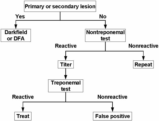 PATHOPHYSIOLOGY OF VENEREAL SYPHILIS Transmission of Treponema pallidum subspecies pallidum results from direct contact with early syphilitic lesions; entry is thought to occur through microscopic fissures in the epidermis or mucous membranes. T. pallidum proliferates at the initial site of infection, resulting in well-circumscribed, indurated, painless lesions called chancres that often become ulcerated or encrusted. This primary stage of syphilis occurs within 10 to 90 days postinfection and typically will resolve within a few weeks. The organism disseminates during this period, and the patient enters into a period of latent infection, in which there are no signs of infection other than serologic reactivity. Secondary syphilis occurs in nearly one third of untreated cases, appearing within 6 weeks to 6 months postinfection. Manifestations consist of multiple macular or papular skin lesions, often accompanied by mucous membrane lesions, patchy hair loss, “nickel-and-dime” lesions on the palms of the hands and soles of the feet, fever, malaise, and lymphadenopathy. Primary and secondary skin and mucosal lesions contain large numbers of T. pallidum and are highly infectious. Syphilitic patients are considered to be infectious during the first year of infection. A period of latent, asymptomatic infection occurs in all untreated individuals and may last the lifetime of the patient. Approximately two-thirds of syphilis patients in the United States are diagnosed by serologic reactivity during the early (<1 year postinfection) or late (≥1 year) latent stages. Tertiary (also called late) manifestations of syphilis typically occur after years to decades in approximately one third of untreated patients and consist of gummatous, cardiovascular, and neurosyphilis forms. Gummas are granuloma-like accumulations of mononuclear cells that can occur in any organ, causing damage through the displacement of normal tissue. Cardiovascular syphilis may present as aortic aneurysm or cardiac valve abnormalities. Neurosyphilis can actually occur at either early or late stages of syphilis and may result in meningovascular inflammation, spinal cord demyelination and deterioration of dorsal root ganglia (tabes dorsalis), or frank infection of the brain (paresis). Congenital syphilis occurs following transmission of T. pallidum across the placenta during the second or third trimester of pregnancy. The range of manifestations includes stillbirth, fulminant, multiorgan infection at birth, and asymptomatic infection at birth followed by the constellation of symptoms that constitute late congenital syphilis. OCULAR MANIFESTATIONS Interstitial keratitis and uveitis in congenital syphilis patients were first reported by Jonathan Hutchinson in 1858.32 Since that time, ophthalmic manifestations have been recognized as common complications of both sexually transmitted (acquired) and congenital syphilis. Any region of the eye can be affected, and presentations include interstitial keratitis, granulomatous and non-granulomatous iridocyclitis, panuveitis, retinitis, retinal vasculitis, and optic atrophy.6,86 Uveitis in nearly all forms may occur at either the secondary or late stages, months to years after the initial infection. In the preantibiotic era, the majority of interstitial keratitis cases were caused by untreated late congenital syphilis, occurring at 5 to 20 years of age. Acquired syphilis also caused uveitis in up to 5% of patients. With the wide availability of penicillin in the mid 1940s, the incidence of syphilis and its impact on ocular disease decreased dramatically in countries where health care and antibiotic therapy were readily available. Any reduction in incidence may apply only to countries and regions with health care access; occurrence of all forms of syphilis (including congenital disease) in some areas of sub-Saharan Africa and Asia often reflect preantibiotic era rates. Recent studies in the United States indicate that syphilis is still a cause of corneal scarring with ghost vessels but is rarely associated with active keratitis.86 In a referral center in New York City,11 8% of uveitis patients had reactive treponemal antibody tests, but other potential causes could be ruled out in only 4% of patients. Ulcerative early lesions of syphilis are thought to increase the transmission rate of human immunodeficiency virus (HIV). Conversely, HIV infection may affect the manifestations of syphilis,31,50 including ocular lesions. For example, dense vitreitis was identified in three patients infected with HIV.37 In addition, coinfection with HIV, particularly in the late symptomatic phase, may result in deficient antibody responses and lack of reactivity in nontreponemal and treponemal serologic tests for syphilis. For these reasons, it is recommended that patients suspected of having syphilis also be tested for HIV antibody reactivity. Another consideration is that corticosteroid treatment may alter the ocular manifestations of syphilis or serologic reactivity. LABORATORY DIAGNOSIS No ocular manifestations are pathognomonic for syphilis, so diagnosis is largely dependent on a combination of history, general clinical signs, detection of T. pallidum (when early lesions are present), and serologic analysis.51 A general scheme for the diagnosis of syphilis is depicted in Figure 2. T. pallidum in patient specimens can be detected by darkfield microscopy, immunofluorescent staining, polymerase chain reaction (PCR), or animal inoculation. Characteristic primary or secondary lesions combined with the demonstration of T. pallidum in lesion exudates or biopsy samples by darkfield microscopy or immunostaining techniques is considered to be a definitive diagnosis.51 However, detection of T. pallidum by these means is not always available. In addition, spirochetes are present in exceedingly low numbers past the primary and secondary stages and are then difficult to detect by any method. Immunofluorescent identifica
