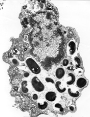 Host cells can also be infected with microsporidian spores by ingesting spores via phagocytosis. Microsporidia have been identified as persisting within macrophages. Confined to a specialized compartment known as a parasitophorous vacuole, microsporidia can avoid the destructive enzymes of a macrophage's lysosomal network. A spore can also escape hostile lysosomal enzymes by using its polar tube to penetrate the wall of the lysosome and injecting its sporoplasm into the free cytoplasm of its host macrophage. Once inside the cytoplasm of the host cell, the microsporidium goes through two major life cycle stages: multiplication (merogony or schizogony) and maturation (sporogony). These developmental phases are species- and host-specific. Many microsporidian genera multiply and mature while floating free among the intracellular organelles within the host cell's cytoplasm. Other genera develop within either a host-produced vacuole (Encephalitozoon) (Fig. 2) or a parasite-produced envelope (Pleistophora).