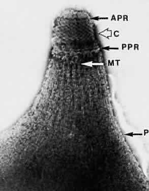 of T gondii is as follows: Phylum: Protozoa The one-celled nature of the parasite justifies its designation as a protozoan. The organism, which measures about 7 μ in length by 2.5 μ in width, has a blunt posterior and a more pointed anterior end. Anteriorly, a “conoid” or primitive mouth is encountered. The conoid contains several internal organelles, including a polar ring from which 22 subpellicular tubules originate (Fig. 2). Rhoptries—specialized organelles that seem to have a secretory function—also terminate in this area, which is known as an apical complex. Hence, the subphylum is called “apicomplexa.” T gondii invades its host by means of sporozoites, eight of which are ultimately derived from each fertilized macrogametocyte, or ookinete. The crescent-shaped sporozoites penetrate the host cell membrane with their conoids, justifying the class designation “Sporozoasida.” Members of this class have both sexual and asexual reproduction. They move by gliding and flexing. The discovery that sexual reproduction of T gondii takes place in the intestinal epithelium of cats immediately before shedding of oocysts in the feces led to its assignment to the subclass Coccidiasina. Members of this subclass are almost exclusively parasites of vertebrates and their gametocytes are intracellular. T gondii, similar to certain other sporozoan parasites including Sarcocystis and Besnoitia species, forms cysts in certain tissues of the host, notably skeletal muscle or brain. These tissue cysts, containing hundreds or thousands of slowly multiplying parasites (bradyzoites), are the product of asexual reproduction. The tissue-cyst walls are derived partly from materials secreted by the parasite and partly from materials that come from the parasitized host cell. The ingestion of animal flesh infested with these tissue cysts facilitates the transfer of the parasite to a new host; the tissue cyst is relatively resistant to peptic digestion in the stomach but is readily susceptible to the action of trypsin in the small intestine. T gondii, resembling Sarcocystis species regarding the formation of tissue cysts derived from asexual reproduction, is considered to be a member of the family Sarcocystidae. All members of this family are monoxenous; that is, their definitive host is a single vertebrate species, such as the cat. All reproduce by a unique form of cell division termed endodyogeny. Lastly, the subfamily Toxoplasmatinae, named after its prototype Toxoplasma species, has many distinct characteristics. Its sporocysts are contained within thin membranes in the oocyst. Both meronts (schizonts) and gamonts (sexual forms) are found within intestinal cells, and the gamonts mate there to form oocysts. LIFE CYCLE As described, T gondii exists in several different biologic forms. On its release from a sporulated oocyst, the sporozoite may multiply rapidly in intestinal epithelium for several generations before migrating through the intestinal wall and invading regional lymph nodes; this rapidly multiplying form is called a tachyzoite. Reproduction of the tachyzoite may occur by schizogony, the simultaneous cleavage of nuclear and cytoplasmic materials to yield several equal-sized merozoites that usually adhere to each other in the form of a “rosette.” Some tachyzoites migrate within the protective milieu of leukocytes to extraintestinal sites, including skeletal muscle, heart, brain, and eye. Here, because of biochemical signals that are as yet imperfectly understood, they become encysted and slowly begin the process of bradyzoite (slow cell) formation. Conditions of cell nutrition, including the availability of the products of oxidative metabolism, may influence the shift to tissue-cyst formation. In contrast, Shimada and associates22 showed that the presence of both specific anti-T gondii antibody and complement in the immediate environment of cultured cells infected with T gondii stimulated the formation of tissue cysts. The rate of reproduction of cells in the mature retina and brain is slow. It may be that certain metabolic factors in the retina and brain favor the formation of tissue cysts in situ after the initial establishment of infection in these tissues. The wall of the tissue cyst is composed of complex proteins and polysaccharides arranged to permit the passage of water, gases, electrolytes, and amino acids across the tissue-cyst-wall barrier but substances of higher molecular weight, such as proteins, are probably excluded. Tissue-cyst formation at these sites is a potential disadvantage for the host because tissue cysts are reservoirs of slowly multiplying organisms that on rupture of the tissue cyst wall can cause a recurrence of inflammation. Organisms within tissue cysts are also harder to kill with drugs than are tachyzoites. Tissue cysts are probably the means by which most T gondii infections are passed from animal to animal. On eating the carcasses of chronically infected animals, birds and rodents become intermediate hosts for the parasite. When they in turn are eaten by cats, the life-cycle may be completed. If a cat has never been infected, the life-cycle may be initiated in the cat's intestine. The factors that influence merozoites (products of asexual reproduction) to become gametocytes are unknown but this conversion can occur only in the intestinal epithelium of the cat (including virtually all members of the cat family—Felidae). The cat is thus the definitive host for T gondii, and all other animal species that become infected with this parasite can be considered incidental or intermediate hosts. The macrogametocytes (female forms) and microgametocytes (male forms) each have their own highly distinctive morphologic characteristics, as demonstrated by Hutchison and associates.20 Microgametocytes generally produce about 12 microgametes, each of which penetrates a mature macrogamete. These forms unite within the superficial epithelium of the cat's intestinal muc