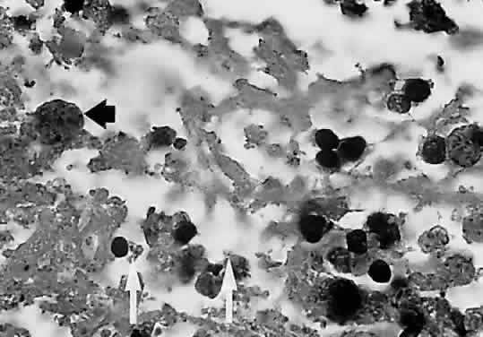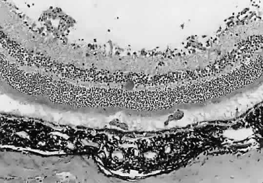 in the inner retinal layers. Healed retinochoroidal scars are characterized by gliosis, obliteration of blood vessels, and hyperpigmentation of borders. Tissue cysts can exist in otherwise normal-appearing retina. Researchers have had the opportunity to study the histopathologic characteristics of ocular toxoplasmosis in patients with AIDS and other immunosuppressant conditions at autopsy because disseminated toxoplasmosis is often a fatal disease (Fig. 5).61,77,106 Unlike disease in immunocompetent patients, parasites can occasionally be seen in the uveal tissue and there is scant cellular infiltration within retinal tissue. As with immunocompetent patients, however, the predominant site of infection appears to be the inner retina. The density of parasites is frequently greatest near blood vessels, suggesting newly disseminated disease rather than recurrence from tissue cysts within the retina. |
