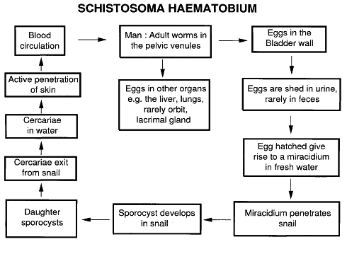 The Cysticercus larvae may reach the eye by way of the choroidal circulation and gain access to the subretinal space.140 The larvae may migrate under the retina and can live in the eye for years. Persistence of the larvae within the ocular tissue may stimulate chronic inflammatory reactions and fibrosis.141 In rare instances, the larvae may be seen in the anterior chamber. In the subretinal location, the parasite may stay in the eye for a while, but with increasing fluid accumulation in the bladder of the Cysticercus, the retina may become detached. The Cysticercus may gain free access to the vitreous cavity and occasionally may cross through the pupillary opening and appear in the anterior chamber. Death of the larvae within the ocular tissues can stimulate a severe inflammatory reaction. Cysticercus larvae may be removed from the subretinal location by surgical intervention without permanent damage to the eye. Once the Cysticercus reaches the vitreous, the prognosis is worse and its removal more difficult. If the parasite dies within the vitreous cavity, its toxic cyst fluid is released, leading to a severe inflammatory reaction. Subretinal Cysticercus can be treated with photocoagulation in an attempt to kill the organism and provide a firm scar. Pretreating such patients with systemic corticosteroids is mandatory to minimize the inflammatory reaction. The ocular adnexa, including the conjunctiva and extraocular muscles, may be involved by the Cysticercus. The most serious form of the disease is cysticercosis of the brain, which leads to seizures and sometimes paralysis and death. The central nervous system lesions seem to resolve spontaneously and may relentlessly cause hydrocephalus and death. Death of larvae within the brain can lead to localized inflammation, fibrosis, and calcification. If the larvae are in the Aqueduct of Sylvius, it can cause hydrocephalus. The severity of the disease depends strictly on the number of eggs ingested. Radiography on the subcutaneous tissue may reveal calcification at the sites of the Cysticercus larvae. Coenuriasis Coenuriasis, a tapeworm disease also known as coenurosis, is caused by Coenurus cerebralis, the larval cystic form of the taeniid worms Multiceps multiceps and Taenia bremneri. The parasite affects primarily the central nervous system of sheep, causing the syndrome of “blind staggers.” In humans, who are an unusual incidental host, Coenurus bladder worms have been reported in the central nervous system and occasionally in the eye and subcutaneous tissues, particularly in Africa. In intraocular cases, it is commonly found in the subretinal space and vitreous,142 and rarely in the anterior chamber. In superficial infestations, however, it is mostly located in the subconjunctival space and less commonly elsewhere.49 It is believed that subconjunctival and subcutaneous infestation, which occurs mostly in children, results from inoculation of the larva directly into the skin or through the conjunctiva during early toddler life, when the skin and eyes are frequently close to ground that may be contaminated. Sparganosis Sparganosis is infection with spargana (plerocercoid larvae) of various species of the diphyllobothriid tapeworm Spirometra, which cannot grow to adult worms in humans, but can reach maturity in certain animals, such as cats and dogs.49 It has been shown that eggs of Spirometra hatch in water, and the emerging coracidia are ingested by copepods of the genus Cyclops, where they develop into procercoid larvae.49 When infected copepods are swallowed by cats or dogs, the procercoids transform into plerocercoid larvae and develop into adult worms. Humans, frogs, snakes, and some birds are acceptable paratenic hosts, although infection remains at the plerocercoid level. Sparganosis may be transmitted in one of the following ways: (1) by drinking water contaminated with copepods harboring the infective procercoids; (2) by ingesting the raw flesh of frogs, snakes, or birds containing the infective plerocercoids; or (3) by poulticing open wounds with the flesh of infected frogs or snakes, a recognized practice in the Far East. Presenting symptoms of ocular sparganosis are nodule formation, lacrimation, edema, redness and pain, and in the case of retrobulbar invasion, a bulging orbit with corneal ulceration. A presumptive preoperative diagnosis may be made on demonstration of periocular nodules. PLATYHELMINTHES: TREMATODES (FLUKES) Schistosomiasis Schistosomiasis is a disease caused by Schistosoma haematobium, Schistosoma mansoni, and Schistosoma japonicum. The life cycle of S. haematobium is shown in Figure 3. Although the adult worms of Schistosoma live in the intravascular space, the eggs of S. haematobium are found in urine of humans, and the eggs of S. mansoni and S. japonicum are found in feces of humans. The eggs of Schistosoma are liberated from the tissues into the lumen of the bladder or the intestine, and the miracidium is liberated from the eggs. The miracidium escapes when a person urinates or defecates in water; the miracidium then swims in the water searching for the appropriate snail to penetrate; it then undergoes a cycle of development, giving rise to cercariae, which are infective to humans. Humans acquire the infection by exposure to water into which the snails have liberated cercariae. The cercariae have certain organs that allow them to penetrate the skin of humans and invade the circulatory system. Intraocular infection by Schistosoma is extremely rare. Occlusion of the central retinal artery has been reported to be caused by the egg of S. mansoni. Occasionally, eggs may be discharged into the circulation, and embolization of the eggs may lead to development of a granuloma in the ocular adnexa. The conjunctiva may be the site of the localized granuloma owing to embolization of the eggs of S. haematobium.143,144 In rare instances, the granuloma may be found in the lacrimal gland.145 Paragonimiasis Paragonimiasi