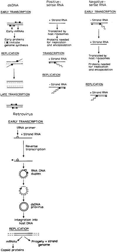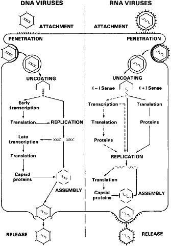 The objective of infection for a virus is the generation of viral progeny. The synthesis of viral-encoded proteins is essential to the ability of the virus to replicate and determines the effect of viral infection on the cell. Although differences exist between enveloped and nonenveloped viruses in the mechanics of infection, the replicative cycle of all viruses can be summarized in six stages (Fig. 1):