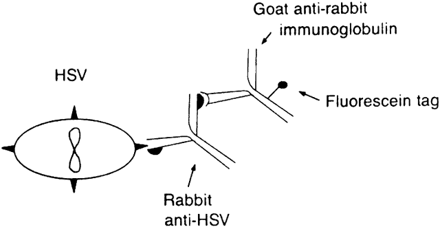 VIRAL CULTURE Viral species differ in the cell lines in which they can grow, although some viruses can grow in a variety of tissues or cells. Herpes simplex virus (HSV), for example, can be isolated after intracerebral inoculation of suckling mice, from the chorioallantoic membrane of embryonated hen eggs, from mink lung, or from several susceptible cell lines. Conversely, some viruses (e.g., adenovirus) are difficult to isolate and may require specific human cell lines for isolation. Cell culture generally includes essential ingredients for cell growth, serum, antibiotics, and antifungals. Depending on the virus in question and its particular cell culture requirements, a specific cytopathic effect on the cell line is achieved. Cell culture is the gold standard for confirmation of suspected viral infection. Many authorities believe cultures underestimate the true prevalence of active HSV infection,1–3 as viral cultures are quite specific but may lack sensitivity.4 Unfortunately, viral cultures are relatively expensive, are laborious, and require 1 to 5 days. Consequently, this tool is not available at every hospital and is almost never found in a private office. CYTOLOGY Exfoliative Cytology Conjunctival exfoliative cytology, a well-established technique familiar to all ophthalmologists, is an important if underappreciated diagnostic tool. Gram stain, almost universally available in a hospital setting, is perhaps the prototype for diagnostic exfoliative cytology; however, this technique is designed principally for bacteria and fungi rather than viruses. Giemsa stain emphasizes cellular morphology and can be useful in diagnosing viral infections. Tzanck smear is another simple, inexpensive preparation used to show viral-induced cellular abnormalities.5 HSV infections often show multinucleated giant cells with either Giemsa stain or Tzanck smear.5 These epithelial cellular aggregates with 3 to 20 nuclei have relatively little cytoplasm and a pale halo between nuclei and cytoplasm. Although somewhat difficult to find on a smear, multinucleated giant cells are diagnostic of infection by either HSV or varicella-zoster viruses (VZV). Less specifically, lymphocytes predominate in smears from superficial viral infections. Intranuclear viral inclusions may be found with Giemsa stain, with Tzanck smear (with eosin),5 or perhaps better with Papanicolaou stain. HSV and cytomegalovirus (CMV) infections produce intranuclear eosinophilic inclusions (Lipschutz inclusions), but these are difficult to find with any of the three stains. Molluscum contagiosum produces eosinophilic cytoplasmic inclusions (Henderson-Patterson inclusions), especially from expressed lesions, although inclusions are best seen with hematoxylin and eosin staining. Although these exfoliative cytologic techniques are perhaps less sensitive and specific than newer immunologic tools, they are inexpensive and quick and are an essential base for many of the newer methods. The application of these cytologic techniques is not limited to exfoliative cytology. Cell samples from intraocular fluids or ocular biopsy may be evaluated by any of the previously mentioned cytologic techniques. Exfoliative cytologic samples are usually applied directly to a slide or can be obtained by impression cytology.6 However, intraocular fluids are best handled by centrifugation7 or cytocentrifugation8 before microscopic evaluation. Membrane filter techniques,9,10 which require that the fluid be passed through a filter (e.g., Millipore), trapping solid material, are perhaps superior to both centrifugation and cytocentrifugation.10 This technique is especially valuable with scanty specimens. Cell block techniques can be used on the pellet formed with centrifugation as well as for small fragmented biopsy material. Electron Microscopy Electron microscopy with negative staining is relatively quick (2 to 5 hours), but it requires an electron microscope, trained personnel, and a sample with an adequate number of viral particles. It is also less sensitive than viral culture techniques. Occasionally the technique is useful, as illustrated by one report of herpetic uveitis diagnosed by examination of cells in the aqueous humor.11 Immunologic Exfoliative Cytology Immunocytochemistry techniques have been used for more than 30 years. Indirect and direct immunofluorescent techniques, immunoperoxidase techniques, and most recently immunoenzyme techniques are available. The indirect immunofluorescent technique is performed by placing cells from the infected area on a clean glass slide. A primary antiserum obtained from an animal (e.g., rabbit) vaccinated against the suspected antigen is then applied. A fluorescein-conjugated, second antiserum from a different species (e.g., goat) is directed against the immunoglobulin type of the primary antiserum (e.g., goat antirabbit immunoglobulin) (Fig. 1). Controls include suspected antigen-bearing cells stained with a negative primary antiserum (or not stained at all), followed by all reagents. Such controls provide a measure of nonspecific fluorescence.12
