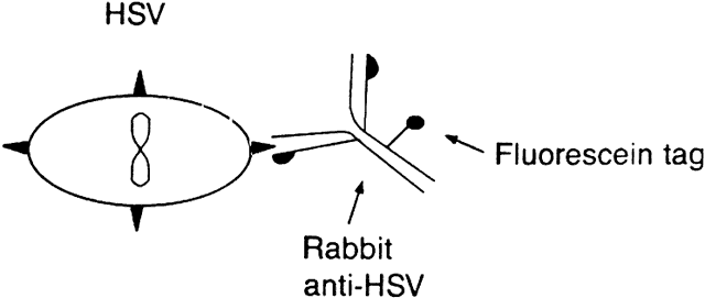 The direct immunofluorescent technique is a variation on the indirect technique.1 Primary antibody is produced by vaccinating an animal (e.g., rabbit) with antigen (e.g., HSV). The primary antibody is then conjugated to fluorescein isothiocyanate. The antiserum containing this conjugated antibody is applied to a slide containing the cells suspected to have the antigen, and the immunofluorescence is evaluated (Fig. 2). The immunofluorescent techniques have advantages and disadvantages. Both the direct and indirect methods are rather sensitive, although generally the indirect test is more sensitive. Slides stained by these techniques can subsequently be stained by conventional methods for light microscopy. These immunofluorescent techniques are particularly good for diagnosing infection by HSV, VZV, CMV, adenovirus, and enterovirus.