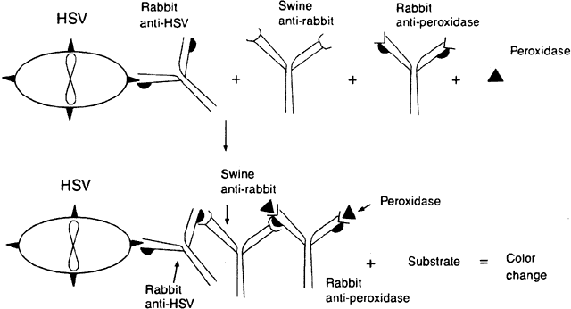 Both indirect and direct techniques may be performed with polyclonal antiserum or monoclonal antibodies. Tests involving polyclonal antibodies may be more sensitive but less specific than tests using monoclonal antibodies. If the antigen to which the monoclonal antibody is directed (e.g., a segment of amino acids from the capsid protein of HSV) is not present on the slide, the antibody will not bind to the agent. Hence, monoclonal antibodies are very specific but may lack sensitivity. Although pooled monoclonal antibodies can be used to increase sensitivity, the immunofluorescent techniques are not commonly used in conjunction with monoclonal antibodies because of this problem. The anticomplement immunofluorescent technique is another variation on immunofluorescent techniques. Primary antibody prepared in animal against the suspected antigen (e.g., HSV) is applied to the slide after application of the infected cells (e.g., HSV-infected corneal or conjunctival cells). Complement that attaches to the antigen-antibody complex is then added. Fluorescein-tagged antibodies to the C3 component of complement are then added to detect the complement bound by the antigen-antibody complex. This technique offers better specificity than the immunofluorescent techniques because it has less nonspecific staining,13 but it is not widely used. Based on an enzymatic immunoassay similar in many respects to immunofluorescence, immunoperoxidase studies use the activity of horseradish peroxidase rather than fluorescence as the indicator on primary (direct immunoperoxidase) or secondary (indirect immunoperoxidase) antibodies.14 The principles and methods are otherwise similar to those discussed for immunofluorescent techniques. Antigen-antibody immunoperoxidase complexes are detected colorimetrically after the addition of a specific substrate. Enzymatic cleavage of the substrate causes the cells to change color.15 With immunoperoxidase, a light microscope may be used for detection.16 Immunoperoxidase and immunofluorescence differ little in sensitivity or specificity. Another variation on the immunofluorescent or immunoperoxidase technique is the immuno-gold silver staining technique, believed by some investigators17 to be more sensitive. In this procedure, the specimen is overlaid with a rabbit anti-HSV antiserum, followed by antirabbit anti-HSV antiserum conjugated with colloidal gold. The presence of virus antigen is then detected by light microscopy as distinct black-staining deposits from silver development.18 Peroxidase-antiperoxidase (PAP) techniques are similar to indirect immunofluorescent techniques but distinct from immunoperoxidase techniques. The suspected cells bearing the antigen are applied to the surface of a slide. The slide is stained with, for example, rabbit antibody to the antigen in question. The slide is then stained with a second species (e.g., swine) to rabbit immunoglobulin. Finally, peroxidase and a rabbit antibody to peroxidase are added to the slide. The peroxidase couples with the rabbit antiperoxidase and the swine antibody couples with the molecules of rabbit globulin-peroxidase, creating a large complex (Fig. 3). The immunoglobulin formed to peroxidase must be from the same species (in this example, rabbit) as the immunoglobulin to the antigen. When a substrate is added to stain the peroxidase complex, the activity of the enzyme on the substrate can be detected microscopically.16,19,20