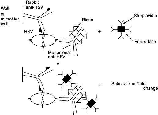 Enzyme-linked immunosorbent assay (ELISA) methods differ from previously mentioned techniques because the antibody is attached to a solid surface such as a microtiter well or plastic bead, and the antibody is said to capture the antigen in the specimen. Alternatively, if desired, the antigen can be attached to the solid phase and used to capture the antibody in the specimen—hence the name immunosorbent. ELISA techniques vary,23–26 but the principles can be illustrated by review of the following example of the direct noncompetitive “sandwich” method. A specimen (e.g., corneal or conjunctival epithelial cells) is inoculated into a plastic microtiter plate in which the wells have been coated with rabbit polyclonal antibodies to the suspected antigen (e.g., HSV). A monoclonal, biotinylated HSV-specific antibody reagent (from a hybridoma) is added. After rinsing, streptavidin-horseradish peroxidase and indicator substrate are added sequentially. The antigen is captured by the solid (plastic) phase antibody that maintains the antigen during the subsequent rinses. The biotinylated HSV-specific monoclonal antibody binds to the stabilized antigen. The streptavidin-horseradish peroxidase complex binds because of avidin's high affinity for biotin. When the indicator substrate is added, peroxidase will produce a colorimetric change, proving the presence of the complex and, hence, the original antigen (Fig. 5). This, too, is an amplification process because each HSV-specific antibody has multiple biotin molecules and the enzyme will continue to act on the substrate molecules present in abundance.