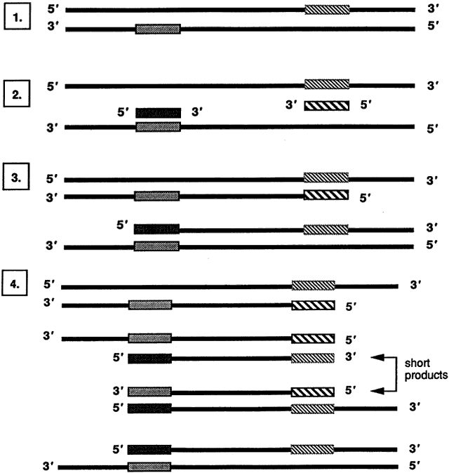 Depending on the thermocycler used, mineral oil may be layered over the reaction mixture to prevent evaporation. DNA from a tissue or cytologic sample must first be prepared using traditional techniques involving phenol/chloroform extraction followed by alcohol purification. Some samples, such as corneal and conjunctival scrapings, can be prepared by placing the specimen in a modified buffer solution containing detergent (e.g., sodium dodecyl sulfate) to lyse cells, followed by heating or boiling of the specimen to denature proteins. Although the extracted DNA is not as pure as that obtained using traditional techniques, this simple method can be used to amplify clinical specimens effectively. Denaturation of the reaction mixture involves heating to 94°C to separate double-stranded DNA into single strands. The DNA remains in single strands until the temperature is lowered in the second, primer-annealing, step of the PCR. Single-stranded target DNA may then anneal to single-stranded oligonucleotide primers, which are present in huge excess in the reaction mixture. The temperature used for annealing is usually in the range of 37°C to 65°C and is determined empirically along with the duration of the reaction, depending on the stringency required. DNA synthesis occurs in the final step of the PCR, whereby annealed primers are extended by Taq DNA polymerase in the presence of excess deoxyribonucleotide triphosphates (dNTPs), usually at a temperature of 72°C. DNA synthesis begins at the 3' end of the primer and proceeds in the 5' to 3' direction. A new complementary strand of DNA is synthesized from each annealed primer. Each newly synthesized strand of DNA can then serve as a template for further primer extension reaction. This results in a geometric amplification of DNA with each cycle of the PCR, hence the aptly named chain reaction that makes this technique exquisitely sensitive in detecting a target DNA sequence. Most PCRs require at least 30 cycles that progressively deplete the relative numbers of primers and dNTPs while the number of short products expands geometrically (see Fig. 6). The repetitive cycling of temperatures for precise periods of time is conveniently performed in commercially available automated thermocyclers that can process up to 96 samples in a few hours. PCR products are visualized by electrophoresis of sample aliquots in agarose or polyacrylamide gels, followed by staining with ethidium bromide. The size of amplification products is determined by using molecular weight markers during gel electrophoresis. The identity of amplified products can then be confirmed by Southern blot hybridization using internal DNA oligonucleotide probes, or by sequence analysis of the products. PCR can also be used to detect RNA sequences and is more sensitive than Northern transfer or in situ hybridization.32 Because DNA polymerase will not work on RNA templates, retroviral reverse transcriptase is used to synthesize complementary DNA (cDNA) to the RNA. This is then amplified by PCR. The exquisite sensitivity of PCR in amplifying small quantities of target DNA sequences is one of its major drawbacks. False-positive results may occur after inadvertent transfer of a minuscule quantity of DNA into reagents from neighboring sample tubes. To avoid false-positive results, techniques have been developed that include physical separation of PCR reagents and DNA samples,33 and “sterilization” of PCR products against further amplification (e.g., by ultraviolet irradiation).34–37 The former involves preparing samples in a separate room or biosafety hood from that in which DNA samples are stored and amplified. Eppendorf tubes and deionized water used in the procedure should be autoclaved, and gloves should be worn at all times and changed frequently to avoid transfer of amplified DNA. Separating reagents into aliquots and preparing master mixes of reagents also helps prevent contamination by minimizing the number of sample transfers. Eppendorf tubes containing a lyophilized reaction mixture pellet (containing dNTPs, reaction buffer, and Taq DNA polymerase) are now commercially available and require only the addition of primers, DNA sample, and deionized water. Positive displacement pipettes or disposable pipette tips containing plugs prevent cross-contamination from aerosolized DNA in the barrel of a pipette device. DNA should also be the final agent added to any reaction solution. Finally, all PCR runs should contain positive and negative control DNA samples, along with a reagent blank (no added DNA) to help locate contamination (false-positive results), failure or inhibition of the PCR itself (false-negative results), or inadequate nucleic acid extraction or purification from the sample. Traditionally, detection of amplified PCR products was through gel electrophoresis, often combined with a hybridization process using radioactive probes. Although sensitive, these methods are time-consuming, labor-intensive, and costly, making them poor techniques for the clinical diagnostic laboratory. Nonisotopic detection formats have been developed in which amplified PCR products are detected using an ELISA format, with biotinylated oligonucleotide probes bound to microtiter plates that undergo a colorimetric reaction by means of a streptavidin-horseradish peroxidase conjugate.38,39 This semiautomated technique can provide PCR results in 2 to 4 hours, as opposed to the 12 to 24 hours required with traditional PCR/isotopic hybridization methods. DNA probes to a portion of a viral genome can also be used on nonamplified samples using similar colorimetric detection formats with reasonable sensitivity and specificity. VIRAL SEROLOGY Serologic diagnosis of viral infections is usually an adjunctive test for ocular infection. A positive serologic test does not necessarily indicate that the suspect virus is the cause of the ocular infection. Enzyme-Linked Immunosorbent Assay A variety of both direct and indi