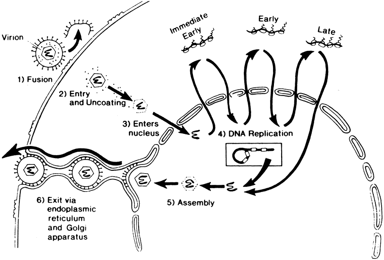 PRODUCTIVE (LYTIC) INFECTION Like all viruses, HSV-1 is an obligate, intracellular parasite and, therefore, requires a healthy host mammalian cell to produce new progeny viruses through a productive (lytic) replication cycle6 (Fig. 3). Following attachment of the virion to the host cell by specific receptors (viral envelope glycoproteins gB and gC and cell surface heparin sulfate), the nucleocapsid gains entry to the cell by fusion of the envelope with the plasma membrane. The nonenveloped nucleocapsid is transported via cytoskeletal elements of the host cell to the nuclear pores where the viral DNA is released into the nucleus. A tegument protein of the parental virus rapidly inhibits host protein synthesis to allow for efficient translation of virus-specific transcripts by host ribosomes.24 After viral DNA enters the nucleus, a well-coordinated cascade of events takes place that leads to gene expression. In general, viral DNA is transcribed in the nucleus into messenger ribonucleic acid (mRNA) molecules using host RNA polymerase II in participation with several viral factors. The virus-specific mRNAs are then transported to the cytoplasm where they bind to host ribosomes to assemble amino acids into virus-specific proteins. It is important to recognize, however, that HSV-1 gene expression is tightly regulated and actually occurs as a cascade in three distinct waves of transcription to yield three distinct classes of viral proteins designated immediate-early (alpha), early (beta), and late (gamma).25 Transcription of immediate-early genes is stimulated by a tegument protein known as VP16 or α-transinducing factor (α-TIF) of the parental virus that requires an existing cellular transcription factor to function, but does so in the absence of de novo virus-specific protein synthesis.26 The synthesis of immediate-early proteins reaches peak rates at approximately 2 to 4 hours postinfection. Immediate-early proteins have regulatory functions and are required for the synthesis of the second group of viral proteins, the early proteins. This group of proteins reaches peak rates of synthesis at about 5 to 7 hours postinfection and includes many enzymes involved in viral DNA replication such as thymidine kinase and DNA polymerase. Importantly, the early proteins serve to downregulate the synthesis of immediate-early proteins and ultimately to induce the synthesis of the late proteins. Structural proteins such as the capsid proteins and envelope glycoproteins are included among the late proteins that also serve to downregulate the synthesis of the early proteins. Late proteins destined to become envelope glycoproteins acquire their carbohydrate sidechains by using the glycosylation machinery of the host cell. Completed glycoproteins are inserted into all host cell membranes including the plasma membrane where they serve as important targets for immune surveillance. Viral DNA replication takes place in the nucleus following early gene expression that supplies many of the enzymes needed for DNA synthesis. The HSV-1 genome contains three origins of DNA replication that leads to DNA synthesis by a rolling circle mechanism, yielding concatamers that are cleaved into monomers and ultimately packaged into capsids.27 Why three origins of replication exist on the HSV-1 genome remains unclear. Only a small portion of the total input viral DNA from parental virions is actually replicated. Assembly of progeny virus particles occurs in several distinct stages. Following the packaging of newly synthesized DNA into preassembled capsids, the virus matures and acquires infectivity by budding through the inner lamella of the cellular nuclear membrane that has been modified by the insertion of several different virus-induced glycoproteins. The mechanism by which the mature virus particle exits the host cell remains a topic of debate. The favored hypothesis includes transport of the virus from the nucleus to the cell surface via the endoplasmic reticulum and Golgi apparatus. In fully permissive tissue culture cells, the entire productive (lytic) replication of HSV-1 takes approximately 18 to 20 hours. Cells that are productively infected with HSV-1 do not survive. Productively infected cells undergo major structural and biochemical alterations almost at the outset of the reproductive cycle. These profound alterations ultimately result in the death and destruction of the host cell, a process known as virus-induced cytopathology. ESTABLISHMENT AND MAINTENANCE OF LATENT INFECTION HSV-1 is transmitted to mucosal surfaces by close personal contact. The most common site of primary HSV-1 infection is in the facial area served by the maxillary division of the trigeminal nerve. Although primary virus infection is often inapparent, infection of this area leads to the establishment of a latent infection in the maxillary division of the trigeminal ganglion (Fig. 4). Following a round of productive infection in epithelial cells, the virus enters the nerve endings of the local sensory and autonomic nerves innervating the area of infection. Virus replication in epithelial cells may not be an absolute requirement, however, because replication-defective HSV-1 mutants can also infect neurons and establish a latent infection in experimental animals.28 It is thought that the virus loses its envelope on entry into the neuron, and the nucleocapsid is transported by microtubule-dependent retrograde axonal flow to the neuronal cell body at a rate of 5 to 10 mm/hr.22 In some neurons, virus undergoes a productive replication cycle that results in the spread of new infectious virus particles to other neurons via transsynaptic spread. This would account for local virus spread among cells within the ganglion (including nonneuronal satellite cells), more distant virus spread to other ganglia through synaptic contact, or possible virus spread to the central nervous system. Primary HSV-1 infection is normally restricted to the trigeminal ganglion