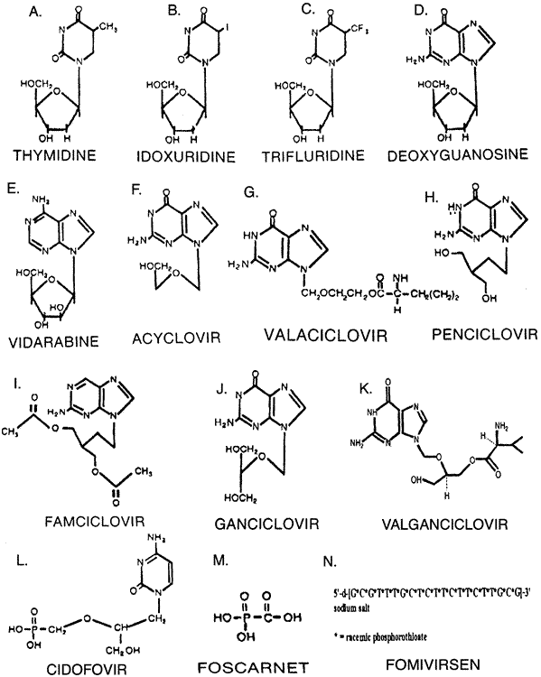 Although it is difficult to target viral components without hitting a few cellular components on the way, important advances have been made in antiviral chemotherapy. Nine systemic or intracameral antiviral drugs (vidarabine, acyclovir, famciclovir, valaciclovir, ganciclovir, valganciclovir, cidofovir, foscarnet, and fomivirsen) and four topical agents (idoxuridine, vidarabine, trifluridine, and acyclovir) are in widespread use in ophthalmic viral infections. Topical and oral BVDU and interferon show clinical potential but remain largely experimental.1–8 The organisms targeted most effectively by these drugs are herpes simplex virus (HSV), herpes varicella-zoster virus (VZV), cytomegalovirus (CMV), vaccinia, and to some extent, adenovirus and Epstein-Barr virus (EBV). |