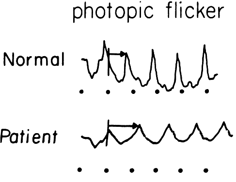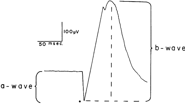 there are two predominant responses, the a-wave and the b-wave (Fig. 1). The a-wave is the initial downgoing deflection and arises from the photoreceptor cells.2 The b-wave is the upgoing deflection that follows the a-wave and arises from the Müller cells.3 While the derivation of the b-wave is from the Müller cells, it reflects such activity from the region of the bipolar cells.4 Under certain recording conditions small wavelets, called oscillations, may be seen riding on the downgoing and upgoing waves (Fig. 2). These oscillatory potentials arise from a number of cell types in the midretinal layers.4 From the foregoing discussion it is clear that the ganglion cells play no role in the generation of the ERG. Therefore, diseases affecting only the inner retina or the optic nerve should not alter the ERG. It is also important to realize that the standard clinical ERG is a mass response reflecting activity from the entire retina. Thus, small localized lesions (e.g., macular degeneration) will not affect the ERG amplitude. METHODS OF EXAMINATION The electrical discharges elicited by the light stimulus are recorded directly from the eye via a contact lens placed on the cornea. The signal is then amplified and visualized on an oscilloscope or directly written out on any x-y plotter. To enhance the signal, the light is usually delivered via a ganz feld (full-field) bowl, a hemisphere used to scatter light throughout the entire retina. This method also avoids some of the problems associated with light scatter. PARAMETERS Two major parameters are used to evaluate the ERG response in the clinical setting. The first is the amplitude of the wave, which is measured in microvolts (μV). The amplitude of the a-wave is measured from the baseline to the trough of the a-wave, while the b-wave is measured from the trough of the a-wave to the peak of the b-wave (see Fig. 1). The implicit time is the second major parameter. It is defined as the time from the stimulus onset to the peak of the response and is measured in milliseconds (msec). The easiest and most accurate measure of the implicit time is the b-wave under light-adapted or photopic conditions (Fig. 3). STIMULUS CONDITIONS Certain stimulus conditions allow the isolation of either the cone or rod responses so that each receptor can be studied independently. Under photopic or light-adapted conditions with a bright background light the rods are sufficiently dampened so that the only response is from the cones. The cone response is rapid with a b-wave implicit time usually between 28 and 32 msec. The cone response can also be isolated by using a rapidly flickering light. The cones follow a flickering light up to 60 to 70 Hz whereas the rods follow a flickering light only up to 12 to 16 Hz. Therefore, a stimulus flickered at 30 Hz elicits a response only from the cone receptors (Fig. 4).
