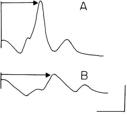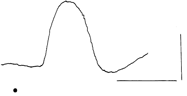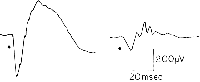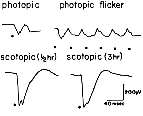 After sufficient dark adaptation (30 min) the rod responses are optimized under these scotopic conditions. A single bright flash gives a response that is a composite of the dark-adapted rods and the dark adapted cones. This response is much larger and has a longer implicit time than the pure cone response. How then does one look at the rods alone? Since the rods are very sensitive to light at the blue end of the spectrum, a weak blue light stimulus produces an essentially pure rod response (Fig. 5).