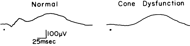 This patient's ERG indicates a complete loss of all photoreceptor function. Although the fundus picture resembles CRA occlusion, the ERG findings point to ophthalmic artery occlusion, presumably due to pressure on the eye from the face mask used for anesthesia. OPAQUE MEDIA Since the standard clinical ERG is a mass response reflecting overall viability of the retina, it is used to assess overall retinal function when the retina cannot be seen, either because of a cataract or due to corneal or vitreous opacities. In the former case the cataract acts as a diffuser of light and in some cases a “supernormal” ERG is seen. A normal ERG in no way indicates whether central vision is normal since macular degeneration or optic atrophy do not affect the ERG amplitude. Corneal opacities likewise tend to diffuse light so a normal ERG again gives information, but just regarding overall retinal function. If the cornea is thin or if there is a reason for not recording with a standard contact lens electrode a gold foil electrode that hooks over the lid may be used. Vitreous opacities hinder the amount of light stimulating the retina so a “bright flash” ERG may be necessary.19 This very intense stimulus is usually sufficient to get enough light to the retina to generate a response and to assess overall retinal function. WHEN SUBJECTIVE COMPLAINTS OUTWEIGH OBJECTIVE FINDINGS As was noted previously, in children who cannot be tested subjectively the ERG may be one of the major objective tests to evaluate visual function. In some adults, either because there are no clinical findings to account for symptoms or because of the patient's inability to communicate, the ERG may be important for diagnosis. CASE 11. A 40-year-old female complained of progressive loss of side vision. She had no prior eye problems. Vision was 20/30 OD and OS. Retinal exam was normal. Visual fields were 5 degrees to a 3/1000 W and did not change with distance or target size. The ERG was normal. The ERG shows that there are no widespread abnormalities to account for the constricted fields. Since the ERG only measures outer retinal function, a visual evoked response (VER) was also performed which was likewise normal. The diagnosis was nonorganic visual loss. A change in the patient's job to a less-demanding position and more within her capabilities led to clearing of all symptoms. CASE 12. A 36-year-old female was seen because of poor night vision all of her life. Her vision was 20/20 in each eye and visual fields and retinal evaluations were normal. The ERG showed a deep negative a-wave and an absent b-wave. These changes, along with the history, are indicative of another form of CSNB (see Table 4).20 This group of disorders may show normal fundi with good vision. Other forms (Oguchi's disease; fundus albipunctatus) may show fundus changes and ERG abnormalities specific to the particular disorder. In Case 12 as well as Case 9 the abnormality in the bipolar cell region is probably a result of an abnormality in neural transmission.21 CASE 13. A 36-year-old male was seen because of difficulty seeing print over the past several years. He also experienced severe glare problems and poor color vision. Vision was 20/70 OD and 20/100 OS. Fundus exam was normal with a good foveal reflex. Color testing on the Farnsworth Panel D-15 was normal. Visual fields showed bilateral central scotoma. An ERG showed a markedly reduced cone response with a normal rod response. The symptoms and the ERG findings are in keeping with the disorder of late onset progressive cone dystrophy.22 This disorder is inherited as an autosomal dominant or is seen sporadically. The disorder seems to start peripherally and gradually moves centrally until vision ultimately falls to a level of 20/200. As noted in Case 6, asymptomatic relatives of affected individuals should be checked because in the early stages, although the intact central cones keep visual acuity and color vision normal, the widespread loss of peripheral cones will severely affect the ERG. CASE 14 (FIG. 17). A 6-year-old boy was noted at school to have a visual acuity of 20/60 in each eye. The parents stated that he had no visual complaints. Both macular areas showed a glistening reflex, which on stereoscopic examination was found to represent cystic spaces in the foveal-parafoveal area. An ERG showed a deep negative a-wave but no b-wave (Fig. 18).