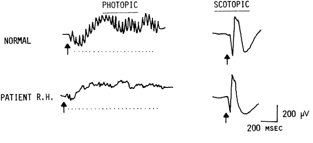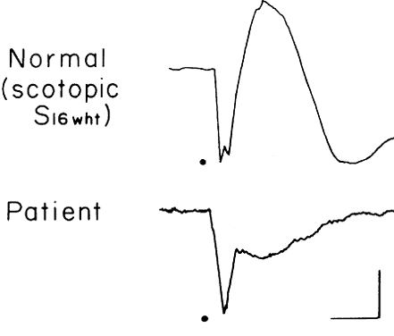 Many such diagnoses may be made by clinical examination, but three disorders may have normal retinal evaluations and can be diagnosed only by the ERG. CASE 7. An 11-month-old boy was evaluated under ketamine anesthesia because of poor vision and nystagmus from birth. The eye exam was normal. ERG revealed an absent photopic flicker response and a normal scotopic response. The ERG indicates an absence of cone function and normal rod function. This congenital hereditary absence or near absence of cones, known as rod monochromatism or achromatopsia, is inherited as an autosomal recessive and is nonprogressive.14 The additional symptom of aversion to light and in older persons, poor color vision, may help in making the diagnosis. CASE 8. A 6-month-old female was examined under ketamine anesthesia because of poor vision and nystagmus from birth. The parents noted irregular wandering eye movements and felt the vision to be extremely impaired. Examination showed mild granularity of the retina and an extinguished ERG. The diagnosis of Leber's congenital amaurosis, a congenital form of retinitis pigmentosa that is inherited as an autosomal recessive, can be made on the basis of the ERG. The retina may look nearly normal in infancy but invariably shows progressive changes during life.15 Vision is usually profoundly impaired but in rare instances may range from 20/60 to 20/200. Associated somatic abnormalities may include cerebellar dysfunction, deafness, and mental retardation.16 CASE 9. A 6-year-old boy was evaluated because of nystagmus and poor vision from birth. The parents stated that the vision had seemed stable and the child was able to read. Recently they were aware their child had difficulty at night. Vision was 20/60 OD and OS with a -7.00 spherical equivalent. Fundus evaluation showed myopic discs but was otherwise normal. The ERG showed a deep normal a-wave but an absent b-wave under scotopic recording conditions (Fig. 15). The ERG indicates normal photoreceptors as evidenced by the normal a-wave but an abnormality in the bipolar cell region as evidenced by the absent b-wave. In this instance the combination of clinical and ERG findings points to a diagnosis of congenital stationary nightblindness (CSNB), a stationary disorder and in this variety usually inherited as an X-linked recessive. This is one of several forms of CSNB (Table 4) and the typical ERG findings in such cases prevents confusion with more serious disorders, particularly when nightblindness is a presenting symptom.