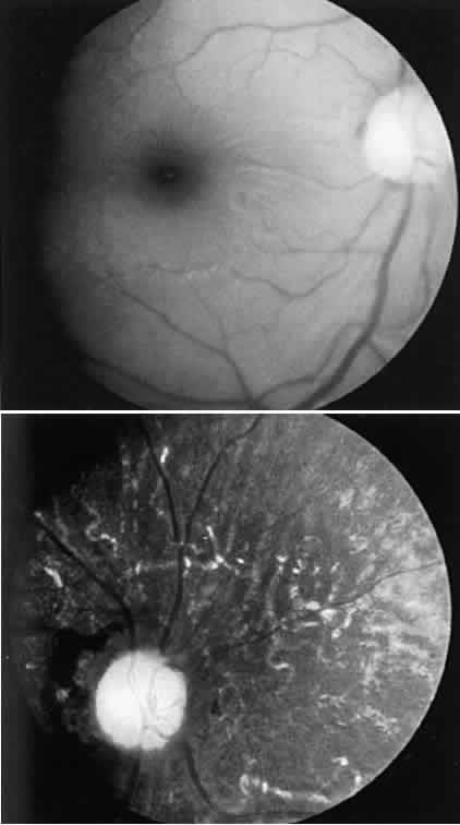 These findings are typical of X-linked juvenile retinoschisis. The abnormality of the ERG probably reflects widespread midretinal changes that in some cases result in the peripheral inner layer retinoschisis seen in 50% of such cases.23 In cases without the peripheral schisis vision usually remains in the 20/60 to 20/80 range. As the patient gets older the central areas of schisis may flatten leaving a nondescript central retinal pigment epithelium (RPE) change. In such cases the typical ERG gives the appropriate diagnosis. |