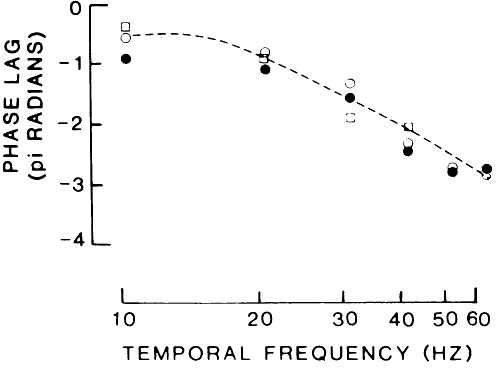has macular degeneration, the standard full-field ERG is normal. The problems of recording the ERG from small areas of the retina, namely the macula, are difficult because of two problems: first, the detection of an ERG signal from such a small area of retina, and second, the indirect stimulation of remote areas by the light stimulus—the stray light effect.24 To counteract the first problem, signal-averaging machines are now commercially available which reduce background noise while enhancing the ERG so that with appropriate summation the electrical response becomes apparent. The second problem, that of stray light, has been overcome by using a background of light to desensitize the retina and then superimposing a stimulus within the illuminated area. Thus, the stray light from the stimulus does not effectively activate the surrounding desensitized retina since the intensity of the stimulus is less than the background light. Because of these restrictions the only area now able to be tested is the macular region and only the cone receptors in that region. Likewise, testing seems effective only for an area greater than 5 degrees. The focal electroretinogram (FERG) can be recorded with a commercially available hand-held recording ophthalmoscope in which the observer places, under direct observation, the stimulus directly on the fovea.25 If there is any movement from the foveal area the machine is shut off and recording is only done when the stimulus is on the foveal area. A second approach uses a remote stimulus centered within a surround of illumination—a ganz-feld bowl.24 Sinusoidal stimuli drive the central cones. The major drawback is that patient fixation cannot be closely monitored. A normal FERG, as recorded over a range of frequencies, has its peak at a frequency between 30 Hz and 40 Hz (Fig. 19). Likewise, the latency of the FERG response (phase lag) varies with frequency24 (Fig. 20). Using these two parameters, amplitude and latency, helps to diagnose a patient with early macular degeneration or conversely, to demonstrate normalcy of the central cone system in a patient with reduced vision.