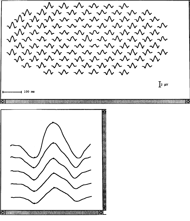 CASE 15. An 11-year-old girl was seen because a visual loss to a level of 20/50 in each eye was noted at school. She had no previous eye problem and the eye exam was otherwise normal. Visual fields were normal although Amsler grid testing showed some irregularity in both central areas. A full-field ERG was normal. The focal ERG showed a marked reduction in amplitude, particularly in the midtemporal frequencies (Fig. 21). A provisional diagnosis of early Stargardt's disease was made. A fluorescein angiogram performed two months later showed a small window defect in both foveal areas, corroborating the diagnosis. This case demonstrates the importance of such a test in cases where a pathologic defect may be diagnosed in the presence of a normal retina. Likewise, if the FERG is normal one may infer that the visual loss is not retinal in nature. Sutter and Tran26 described a multifocal ERG system in which multiple retinal areas are stimulated simultaneously and each response is independently detected. Thus, a topographic ERG map may be constructed of the entire posterior pole (Fig. 22). The study of these responses is in its infancy so the clinical usefulness remains to be determined. |