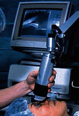 A complete UBM examination consists of the following steps: First, identifying patient information is input into the computer with the light pen. The patient is asked to lie in a supine position on an examination table, and topical anesthetic drops are administered to both eyes. The lid speculum is inserted and filled with viscous fluid, and the probe is brought into position and oriented over the eye. Then the tip of the probe is submerged in the fluid, taking care to avoid trauma to the cornea. Scanning begins with images through the central cornea and pupil. It continues with radially oriented slices through the limbal region for 360° beginning at the 12 o'clock meridian and concludes with additional slices in various planes or regions of interest. When the examination is finished, the lid speculum is removed and the residual viscous fluid is rinsed from the eye with a sterile irrigating solution. An individual study takes approximately 10 minutes per eye. |