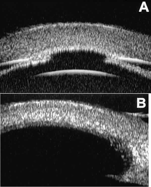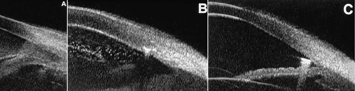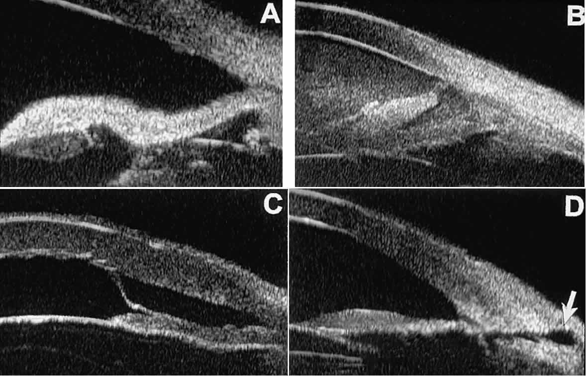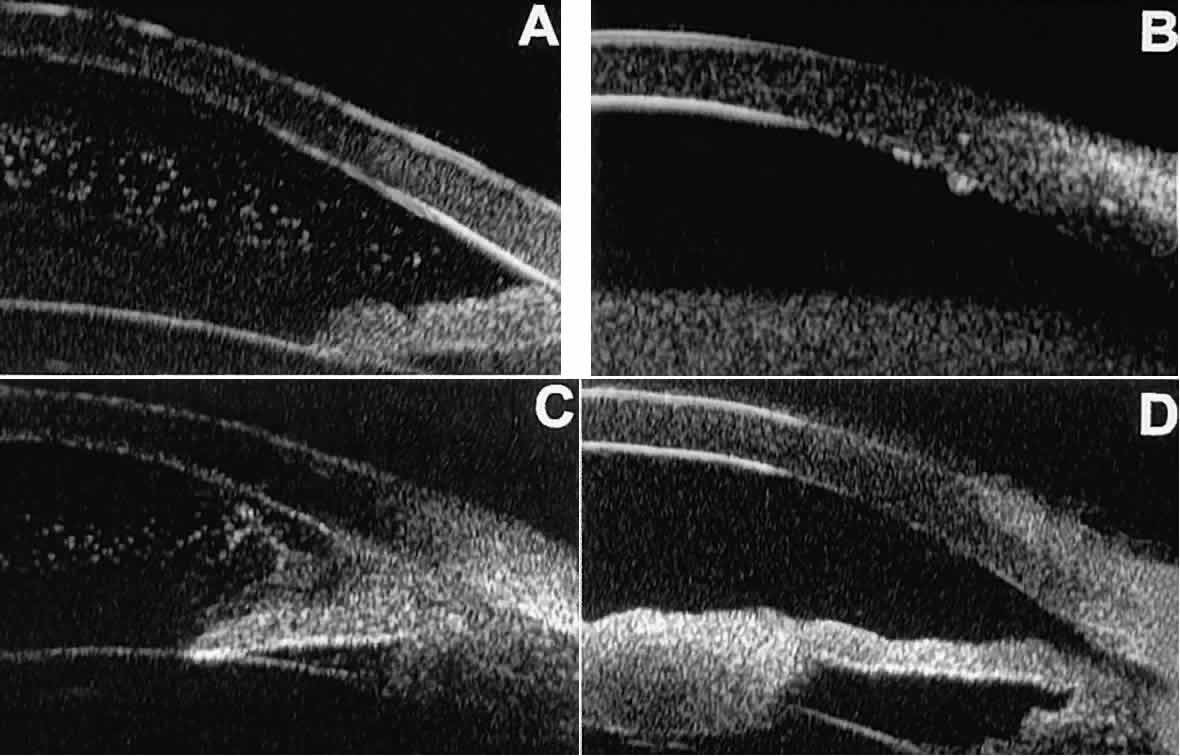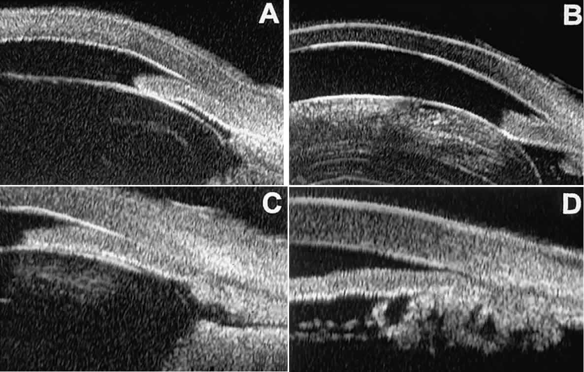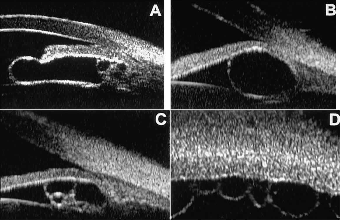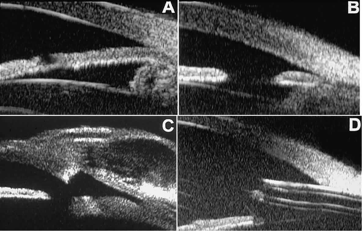 of the cornea, iris, lens, and ciliary body. GLAUCOMA Ultrasound biomicroscopy is usually able to determine the mechanism of elevated intraocular pressure (angle closure versus open angle) by showing the relationship between the peripheral iris and the trabecular meshwork.2–4 A strong correlation between gonioscopic and UBM estimates of angle configuration has been established.5 In addition, imaging of the anterior segment structures is possible even in eyes with profound corneal edema that precludes gonioscopic assessment of the angle. In open-angle glaucoma, UBM can be used to measure the anterior chamber angle in degrees, to assess the configuration of the peripheral iris, and to evaluate the trabecular meshwork (Fig. 9).2,4 The angle configuration can be graded and compared with gonioscopic findings. In certain patients with open-angle glaucoma, UBM can provide information that may be of some diagnostic value (Fig. 10). For example, in pigment dispersion syndrome (see Fig. 10A),6 UBM typically reveals posterior bowing of the peripheral iris (“q” configuration of peripheral iris by Spaeth classification5). In plateau iris syndrome (see Fig. 10B),7 UBM usually reveals abnormally steep anterior angulation of the peripheral iris (“s”configuration of peripheral iris by Spaeth classification5), insertion of the iris from the anterior ciliary body, and retroiridic projection of the ciliary processes. In eyes with peripheral anterior synechiae (see Fig. 10C and D), UBM can reveal the extent of iridocorneal adhesion even if the cornea is hazy or opaque. In eyes with a narrow angle, UBM shows the extent of angle closure, reveals the depth of the anterior and posterior chambers, and identifies pathologic processes pushing the lens and iris forward (Fig. 11).2–4,8 UBM has been able to differentiate between primary angle closure (i.e., cases of angle closure without additional pathology responsible for the anterior lens-iris displacement [see Fig. 11A] and secondary angle closure due to processes such as lens swelling and dislocation (see Fig. 11B), massive hemorrhagic retinal detachment pushing the lens and iris anteriorly (see Fig. 11C), and multiple neuroepithelial cysts of the iridociliary sulcus (see Fig. 11D). Postoperative UBM imaging of the anatomic changes caused by glaucoma surgery often helps to explain mechanisms of success and failure of the various surgical procedures (Fig. 12).3,4 After laser iridotomy, UBM can show whether the iridotomy is partial thickness (see Fig. 12A) or full thickness (see Fig. 12B) and whether the plane of curvature of the peripheral iris has changed compared with the pretreatment findings. After trabeculectomy (see Fig. 12C), UBM can show whether the scleral aperture is patent or blocked internally, whether the peripheral iridectomy is open or blocked, and whether the filtering bleb is flat, shallow, or deep.9 After tube shunt surgery (see Fig. 12D), UBM can show the position of the tip of the tube and whether its orifice is open or plugged. After any type of glaucoma filtering surgery,10 UBM can be used to detect and evaluate the extent of postoperative complications such as ciliochoroidal effusion and cyclodialysis.3,4 In ciliochoroidal effusion (Fig. 13A), UBM shows the ciliary body to be edematous and separated from the sclera by a sonolucent collection of supraciliary fluid. Many ciliochoroidal effusions that are too limited in extent to be detectable by indirect ophthalmoscopy and slit lamp biomicroscopy can be imaged by UBM. In cyclodialysis (see Fig. 13B), UBM shows a well-defined separation between the uveal tissue and the sclera in the region of the scleral spur. The width of the cleft is usually assessed best by means of limbus-concentric images through the region of interest. Ultrasound biomicroscopy has been used to evaluate the angle architecture in some infants and children with congenital glaucoma.3,4 Such eyes often appear to have a thin iris and elongated ciliary processes, but the angle is usually open and does not have any demonstrable membrane. CORNEAL AND ANTERIOR SEGMENT DISORDERS In most patients, the anterior segment can be evaluated thoroughly by slit lamp biomicroscopy unless the cornea is cloudy or opaque. In eyes with a cloudy or opaque cornea, UBM can be used to evaluate the cornea and to define the nature of underlying abnormalities in the angle, iris, ciliary body, lens, and anterior vitreous.4 For example, in eyes with severe congenital malformations of the anterior segment associated with a cloudy or opaque cornea (e.g., Peter's anomaly) (Fig. 14), UBM can be used to define the full extent of the abnormalities and thereby aid the clinician in deciding whether or not to consider any surgical intervention. UBM can also be used to study the extent of some clinically evident corneal abnormalities, such as corneal edema, bullous keratopathy, and band keratopathy (Fig. 15). In eyes with corneal edema (see Fig. 15A), UBM shows the epithelium to be thicker than normal and the stroma to have increased reflectivity. In bullous keratopathy (see Fig. 15B), UBM shows epithelial blisters of the cornea. In band keratopathy (see Fig. 15C), UBM shows superficial calcific deposits that are strongly reflective with shadowing of the underlying structures. In postinflammatory corneal scarring (see Fig. 15D), UBM can show the nonuniform cross-sectional corneal thickness and the presence or absence of a well-defined Descemet's membrane and endothelium layer. Ultrasound biomicroscopy can be used after corneal surgery to evaluate the anterior segment status. After corneal transplantation, UBM can be used to evaluate the apposition of the donor button and host tissue and to assess the presence or absence of vitreous or iris incarceration in the incision. Ultrasound biomicroscopy has also been used to evaluate several anterior scleral disorders,11 including nodular anterior scleritis and scleral hyaline plaques (Fig. 16). On UBM, nodular 
