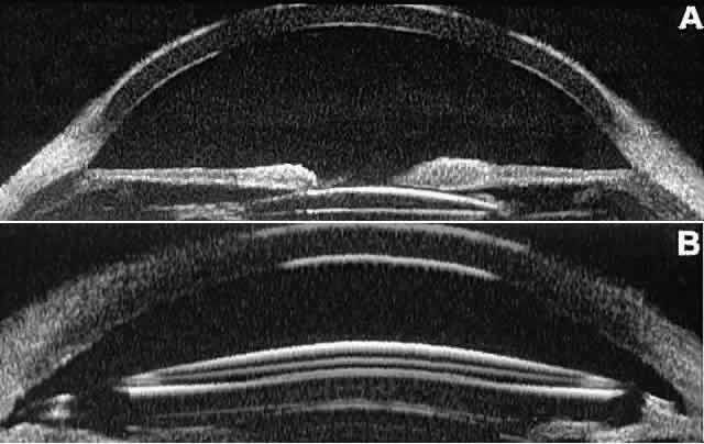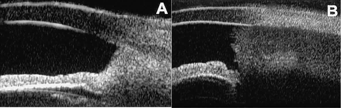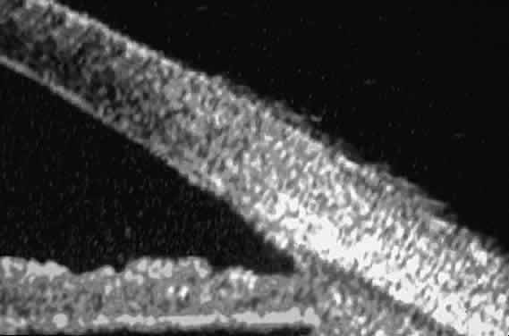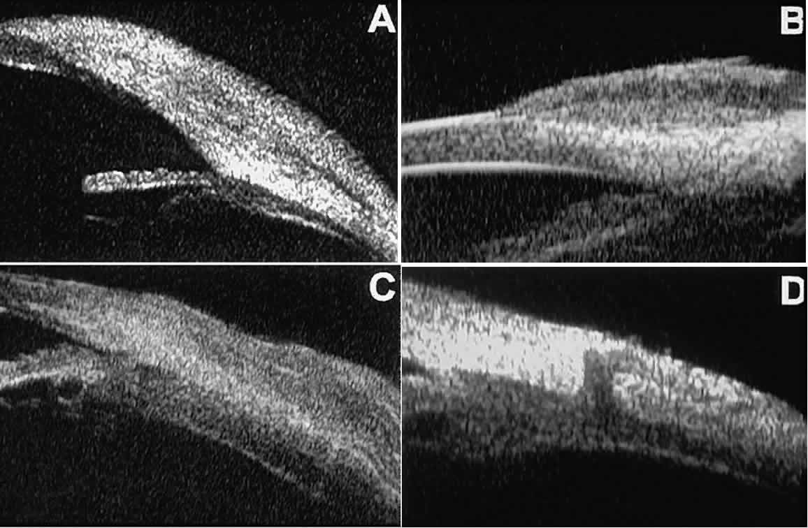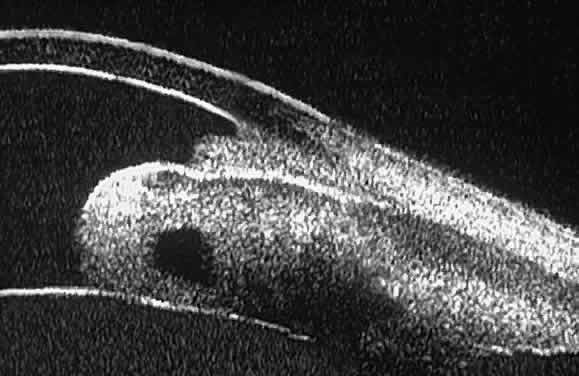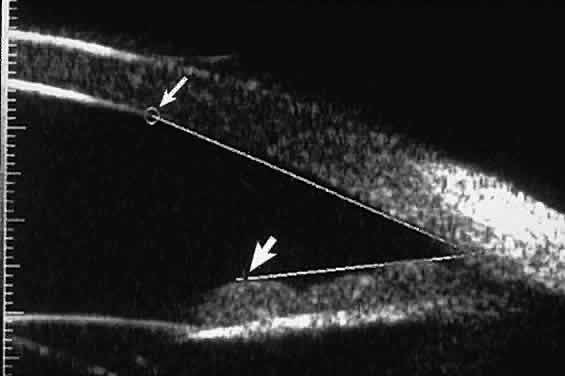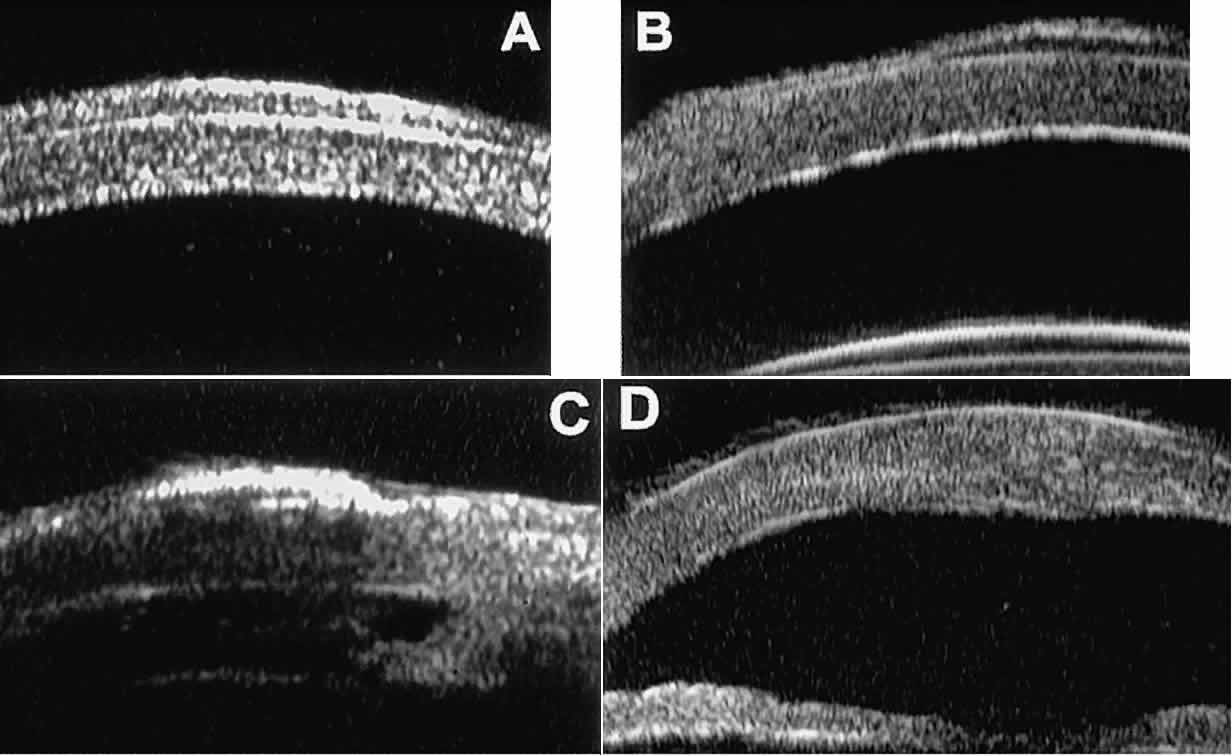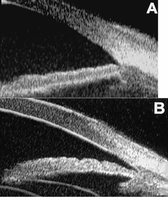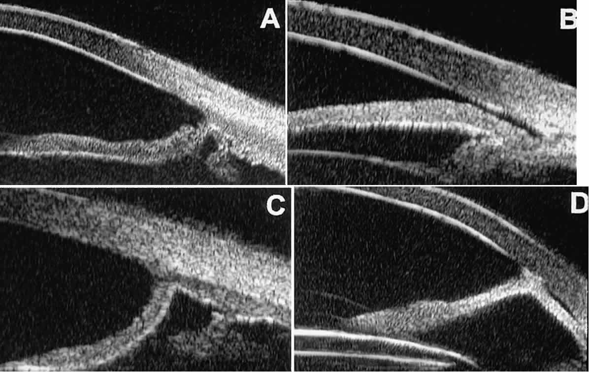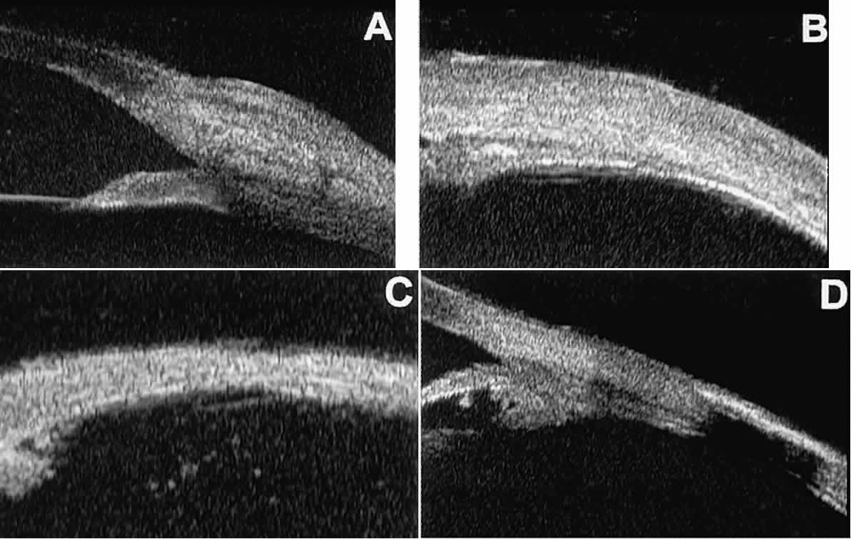 of the cornea, iris, lens, and ciliary body. GLAUCOMA Ultrasound biomicroscopy is usually able to determine the mechanism of elevated intraocular pressure (angle closure versus open angle) by showing the relationship between the peripheral iris and the trabecular meshwork.2–4 A strong correlation between gonioscopic and UBM estimates of angle configuration has been established.5 In addition, imaging of the anterior segment structures is possible even in eyes with profound corneal edema that precludes gonioscopic assessment of the angle. In open-angle glaucoma, UBM can be used to measure the anterior chamber angle in degrees, to assess the configuration of the peripheral iris, and to evaluate the trabecular meshwork (Fig. 9).2,4 The angle configuration can be graded and compared with gonioscopic findings. In certain patients with open-angle glaucoma, UBM can provide information that may be of some diagnostic value (Fig. 10). For example, in pigment dispersion syndrome (see Fig. 10A),6 UBM typically reveals posterior bowing of the peripheral iris (“q” configuration of peripheral iris by Spaeth classification5). In plateau iris syndrome (see Fig. 10B),7 UBM usually reveals abnormally steep anterior angulation of the peripheral iris (“s”configuration of peripheral iris by Spaeth classification5), insertion of the iris from the anterior ciliary body, and retroiridic projection of the ciliary processes. In eyes with peripheral anterior synechiae (see Fig. 10C and D), UBM can reveal the extent of iridocorneal adhesion even if the cornea is hazy or opaque. In eyes with a narrow angle, UBM shows the extent of angle closure, reveals the depth of the anterior and posterior chambers, and identifies pathologic processes pushing the lens and iris forward (Fig. 11).2–4,8 UBM has been able to differentiate between primary angle closure (i.e., cases of angle closure without additional pathology responsible for the anterior lens-iris displacement [see Fig. 11A] and secondary angle closure due to processes such as lens swelling and dislocation (see Fig. 11B), massive hemorrhagic retinal detachment pushing the lens and iris anteriorly (see Fig. 11C), and multiple neuroepithelial cysts of the iridociliary sulcus (see Fig. 11D). Postoperative UBM imaging of the anatomic changes caused by glaucoma surgery often helps to explain mechanisms of success and failure of the various surgical procedures (Fig. 12).3,4 After laser iridotomy, UBM can show whether the iridotomy is partial thickness (see Fig. 12A) or full thickness (see Fig. 12B) and whether the plane of curvature of the peripheral iris has changed compared with the pretreatment findings. After trabeculectomy (see Fig. 12C), UBM can show whether the scleral aperture is patent or blocked internally, whether the peripheral iridectomy is open or blocked, and whether the filtering bleb is flat, shallow, or deep.9 After tube shunt surgery (see Fig. 12D), UBM can show the position of the tip of the tube and whether its orifice is open or plugged. After any type of glaucoma filtering surgery,10 UBM can be used to detect and evaluate the extent of postoperative complications such as ciliochoroidal effusion and cyclodialysis.3,4 In ciliochoroidal effusion (Fig. 13A), UBM shows the ciliary body to be edematous and separated from the sclera by a sonolucent collection of supraciliary fluid. Many ciliochoroidal effusions that are too limited in extent to be detectable by indirect ophthalmoscopy and slit lamp biomicroscopy can be imaged by UBM. In cyclodialysis (see Fig. 13B), UBM shows a well-defined separation between the uveal tissue and the sclera in the region of the scleral spur. The width of the cleft is usually assessed best by means of limbus-concentric images through the region of interest. Ultrasound biomicroscopy has been used to evaluate the angle architecture in some infants and children with congenital glaucoma.3,4 Such eyes often appear to have a thin iris and elongated ciliary processes, but the angle is usually open and does not have any demonstrable membrane. CORNEAL AND ANTERIOR SEGMENT DISORDERS In most patients, the anterior segment can be evaluated thoroughly by slit lamp biomicroscopy unless the cornea is cloudy or opaque. In eyes with a cloudy or opaque cornea, UBM can be used to evaluate the cornea and to define the nature of underlying abnormalities in the angle, iris, ciliary body, lens, and anterior vitreous.4 For example, in eyes with severe congenital malformations of the anterior segment associated with a cloudy or opaque cornea (e.g., Peter's anomaly) (Fig. 14), UBM can be used to define the full extent of the abnormalities and thereby aid the clinician in deciding whether or not to consider any surgical intervention. UBM can also be used to study the extent of some clinically evident corneal abnormalities, such as corneal edema, bullous keratopathy, and band keratopathy (Fig. 15). In eyes with corneal edema (see Fig. 15A), UBM shows the epithelium to be thicker than normal and the stroma to have increased reflectivity. In bullous keratopathy (see Fig. 15B), UBM shows epithelial blisters of the cornea. In band keratopathy (see Fig. 15C), UBM shows superficial calcific deposits that are strongly reflective with shadowing of the underlying structures. In postinflammatory corneal scarring (see Fig. 15D), UBM can show the nonuniform cross-sectional corneal thickness and the presence or absence of a well-defined Descemet's membrane and endothelium layer. Ultrasound biomicroscopy can be used after corneal surgery to evaluate the anterior segment status. After corneal transplantation, UBM can be used to evaluate the apposition of the donor button and host tissue and to assess the presence or absence of vitreous or iris incarceration in the incision. Ultrasound biomicroscopy has also been used to evaluate several anterior scleral disorders,11 including nodular anterior scleritis and scleral hyaline plaques (Fig. 16). On UBM, nodular 