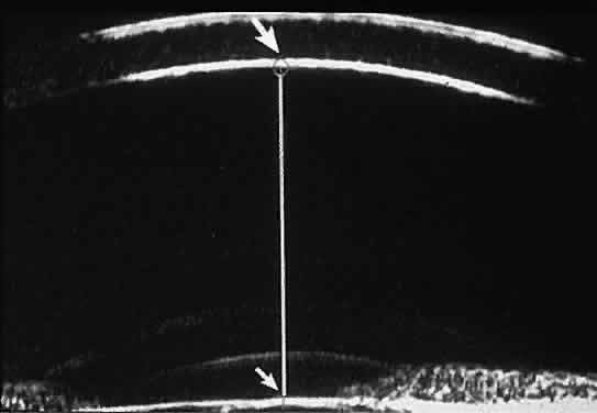 The Humphrey Ultrasound Biomicroscope includes software that allows direct measurement of linear distances (e.g., corneal thickness, anterior chamber depth [Fig. 7], and iris thickness). The measuring cursor is set at one point on the image, and then the trackball is used to drag a line to the second point. The length of the line appears on the screen. Direct angular measurement of the anterior chamber angle in degrees (Fig. 8) is also possible with this instrument, and it contains various brightness and contrast modes, controlled by the trackball and thumbwheel, that can be used to enhance the structural details of the images. |