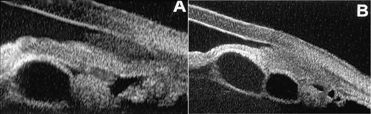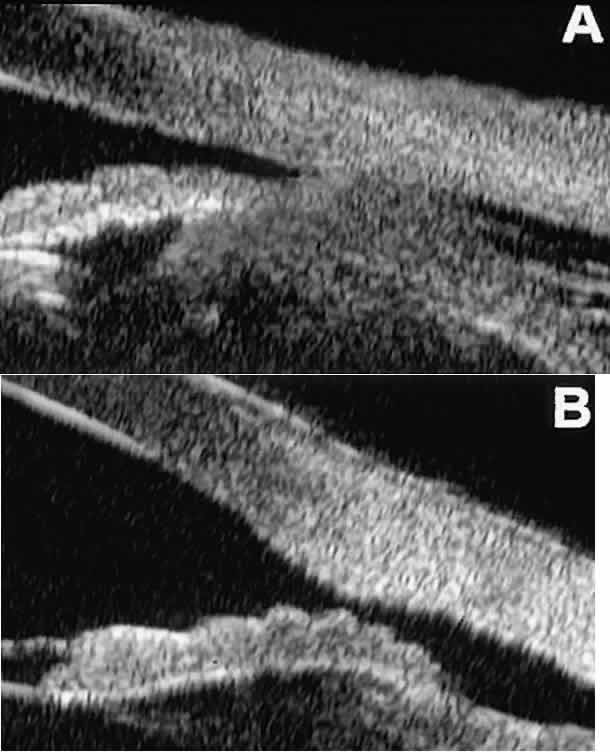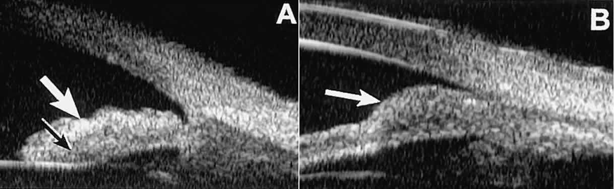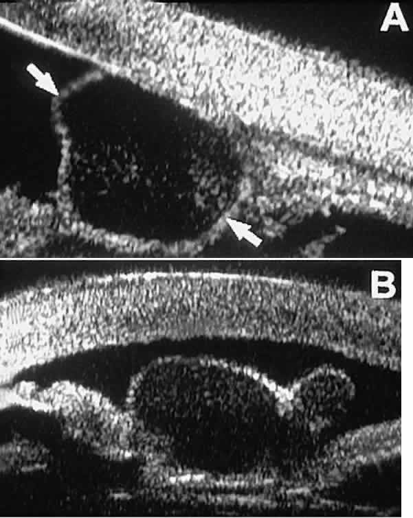 Ultrasound biomicroscopy appears to be helpful postoperatively in determining the extent of postoperative complications of cataract surgery such as serous choroidal detachment (see Fig. 13A), iridocapsular adhesion (Fig. 19A), postoperative hyphema (see Fig. 19B), stripping of Descemet's membrane (see Fig. 19C), and wound gaping (see Fig. 19D). UVEITIS In eyes with iritis or iridocyclitis, UBM can demonstrate many inflammatory features in detail (Fig. 20).4 Inflammatory cells in the aqueous (see Fig. 20A) can be visualized by UBM as sonoreflective particles floating in the sonolucent aqueous. Keratic precipitates appear on UBM (see Fig. 20B) as sonoreflective cellular clumps adherent to the endothelial surface of the cornea. In hypopyon uveitis (see Fig. 20C), UBM shows the collection of white blood cells to be a dependent sonoreflective mass in the anterior chamber with adherence to the peripheral iris. Inflammatory nodules of the iris (see Fig. 20D) appear as relatively ill-defined, moderately sonoreflective lesions expanding the normal iris stroma or lying superficially on it. TRAUMA After blunt ocular trauma, UBM can be used to evaluate iris-angle abnormalities associated with and possibly obscured by hyphema, including angle recession and cyclodialysis, and to illustrate the presence and extent of blood clots.4 Angle recession is characterized on UBM (Fig. 21A) by posterior displacement of the point of attachment of the iris to the sclera. In the acute stage, the post-traumatic recess is usually filled with blood. Cyclodialysis (described and illustrated earlier) appears on radial UBM slices through the limbal region (see Fig. 13B) as a fluid-filled cleft between the sclera and ciliary body.13 This abnormality is by definition associated with at least a localized ciliochoroidal effusion. After ocular perforations, lacerations, and intraocular surgery, UBM can show abnormalities such as retained foreign bodies too small to be imaged by other technologies.3,4 Foreign bodies appear on UBM (Fig. 22A and B) as highly reflective focal lesions that are frequently associated with inflammatory features. OCULAR ONCOLOGY Cysts and solid tumors of the anterior segment can be imaged in great detail with UBM.14,15 This technology can be used to determine the internal character of a lesion (solid or cystic), to ascertain whether the lesion involves the anterior ciliary body or is restricted to the iris, and to measure the full extent of the lesion. Relatively small cysts and tumors of the anterior segment can be imaged in their entirety by UBM. Larger lesions, however, may not be fully imaged by UBM because of its limited depth of penetration and relatively narrow field width. Cystic lesions of the iris and ciliary body can be of four types: primary neuroepithelial cysts, stratified squamous epithelial cysts, neuroepithelial cysts associated with solid tumors, and intratumoral cavities.15 Primary neuroepithelial cysts (see Fig. 22) are very distinct on UBM imaging. These lesions consist of a central sonolucent cavity surrounded by a thin wall of highly reflective neuroepithelial cells. They arise from the posterior surface of the iris (see Fig. 22A), in the iridociliary sulcus (see Fig. 22B and C), or from the inner aspect of the ciliary body (see Fig. 22D). They are often multifocal (see Fig. 22C and D) and bilateral.15 The largest lesions of this type typically occur in or near the horizontal meridians. Stratified squamous epithelial cysts (Fig. 23) are almost exclusively unilateral and unifocal,15 have substantially thicker walls than do primary neuroepithelial cysts, and usually contain prominent intracavitary particles (desquamated epithelial cells). Almost all such cysts involve the peripheral iris and angle region. Such cysts are usually secondary to prior ocular surgery or laceration in which conjunctival epithelial cells were implanted into the iris stroma. Secondary neuroepithelial cysts occur rather frequently in association with solid tumors of the iris or ciliary body.15 On UBM (Fig. 24), such cysts appear quite similar to the primary neuroepithelial cysts described above; however, they are associated with a solid mass arising within the iris or ciliary body. Intratumoral cavitation is a relatively uncommon cystic feature of some solid tumors. An intratumoral cavity appears on UBM as a well-defined sonolucent space within the stroma of the solid tumor (Fig. 25).15 The lack of pulsation during the UBM examination of such lesions and the diameter of the cavity enable the clinician to differentiate the cavitation from a large blood vessel. Solid iridociliary tumors present variable internal reflectivity depending on tumor type.14 Most solid lesions that occur on the iris are nevi. Benign nevi of the iris and ciliary body usually appear on UBM as relatively small hyporeflective lesions replacing a part or all of the underlying uveal stroma locally (Fig. 26). Such lesions usually do not destroy the underlying neuroepithelium of the iris or ciliary body, extend intrasclerally, or have prominent intralesional blood vessels. In contrast, malignant melanomas of the iris and ciliary body are much less common. On UBM, such tumors are usually larger than benign nevi, and they are more likely to have caused focal or extensive disruption of the adjacent neuroepithelial layers, to have invaded the sclera, and to be associated with prominent intralesional blood vessels (Fig. 27). Some malignant melanomas of the ciliary body and most ciliochoroidal melanomas are too large in basal diameter to be fully revealed in a single UBM image, and many of these lesions are also too thick to be measured by this technology. In the case of a melanocytic tumor of the iris or ciliary body that is not clearly either a benign nevus or a malignant melanoma, serial UBM evaluations may prove useful for assessing the tumor's growth and other changes that might warrant either biopsy or complete excision of the mass. UBM has