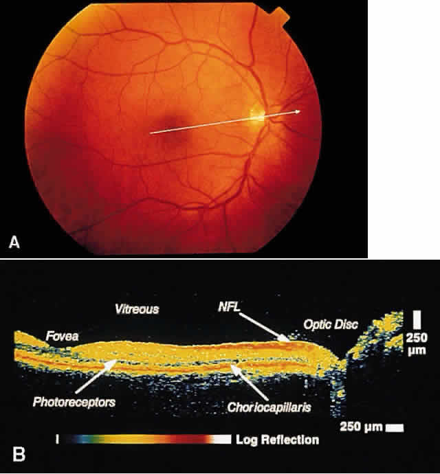 systems are on the order of several hundred microns. The advantages of OCT go beyond its extremely high resolution. Information may be stored on computer disks (Bernoulli disks) and easily accessed for future retrieval. Additionally, the use of a computer-controlled fixation light in the eye being studied provides a reproducible means of acquiring OCT images of the same retinal cross-section on follow-up studies. Thus, comparisons of the same retinal area can be made over subsequent visits. This feature makes OCT particularly useful in the diagnosis and treatment of macular disease. Quantitative measurements of nerve fiber layer thickness can be obtained with OCT, making this a useful test in the management and diagnosis of glaucoma. Other techniques such as stereoscopic videographic imaging, nerve fiber layer photography, or measuring the polarization rotation of reflected light have been used in the assessment of glaucomatous changes. However, these modalities do not provide direct measurements of nerve fiber layer thickness. The limitations of OCT include the inability to obtain high-quality images through media opacities such as dense cataract or vitreous hemorrhage. The use of OCT is also limited to cooperative patients who are able to maintain fixation for the full acquisition time of 2.5 seconds per section. Computer image-processing techniques can eliminate eye movements from fluctuations in the intraocular pressure produced by variations in pulse pressure, microsaccades, and mild tremor but cannot eliminate image degradation from patients with excessive movement. |