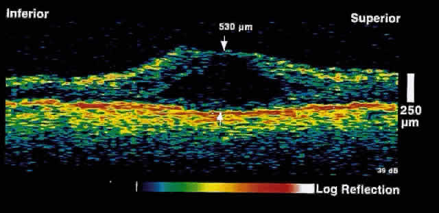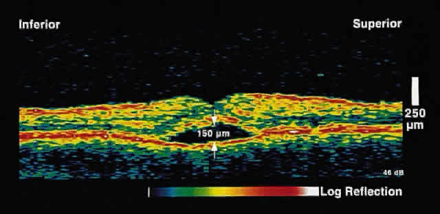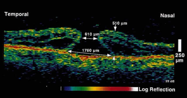 Serous Macular Detachment Secondary to Optic Nerve Pit Optical coherence tomography images of this clinical entity clearly demonstrate the relation between the optic nerve pit and serous macular detachment (Fig. 4). These images support the concept that fluid from the optic pit directly enters the neurosensory retina and not the subretinal space.13 Macular Edema Optical coherence tomography offers an objective test for serial, quantitative evaluations of retinal thickness.14 Increases in retinal thickness are usually caused by accumulation of intraretinal fluid, widening the distance between the well-delineated anterior and posterior boundaries of the neurosensory retina. Because of the high axial resolution of OCT, retinal thickness can be measured to within 10 microns and followed serially. Macular edema is the leading cause of decreased vision in patients with diabetic retinopathy. Although “clinically significant macular edema” continues to be a clinical diagnosis, OCT can provide the clinician with additional useful information. OCT images can quantitatively measure the amount of retinal thickening present; the amount of thickening has been shown to correlate with visual acuity.15 Additionally, OCT can be used to follow the clinical response to focal laser treatment for clinically significant macular edema, and successful resolution of macular edema after laser treatment may be observed (Figs. 5 and 6).